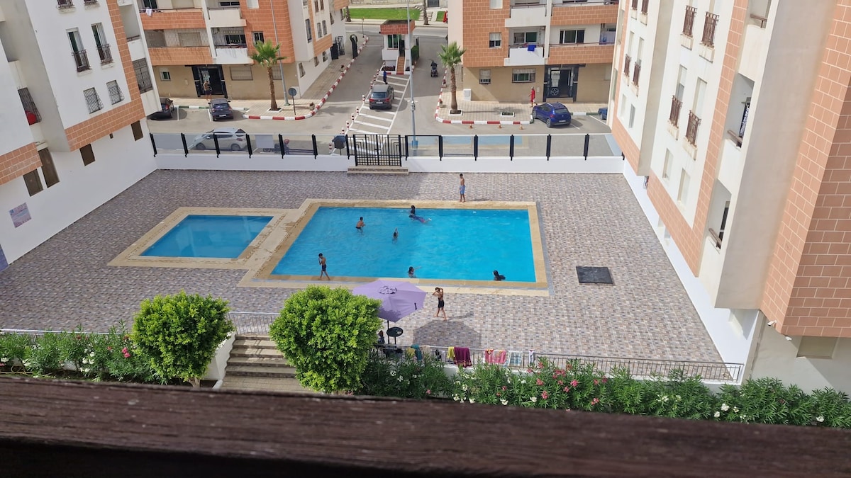 The apartment has 3 bedrooms close to all sites and amenities. • 3 min walk to the beach. • 1 min walk to the Corniche. • 10 min walk to TGV station & City Mall Tanger. • Secured building 24/7 (camera at entrance & concierge). • Free parking on site. • Outdoor pool 5 min walk. • Pool open July & August only. • Pool for all. Free swim for 4 people, then 40 DH/extra person.
