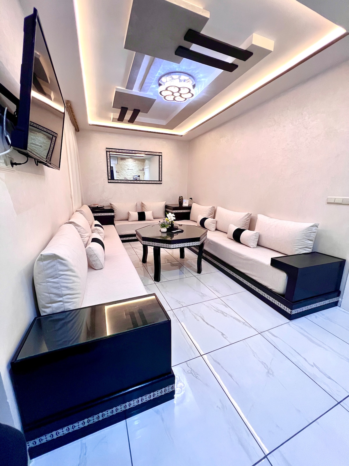 Vous êtes à la recherche d'un appartement moins cher qu'un hôtel. Découvrez cet appartement luxueux en plein centre-ville de Tanger et avec vue partielle sur mer, à 2 min de Marina ,près des cafés et boutiques ,du Mall Ibn Batouta ,de l'ancienne médina et monuments historiques .Le point de départ idéal pour explorer la ville. Cet élégant appartement d'une chambre, un salon ,une terrasse vue mer ,une cuisine américaine , un climatiseur , une WIFI , ( espace de travail ) , smart TV .
