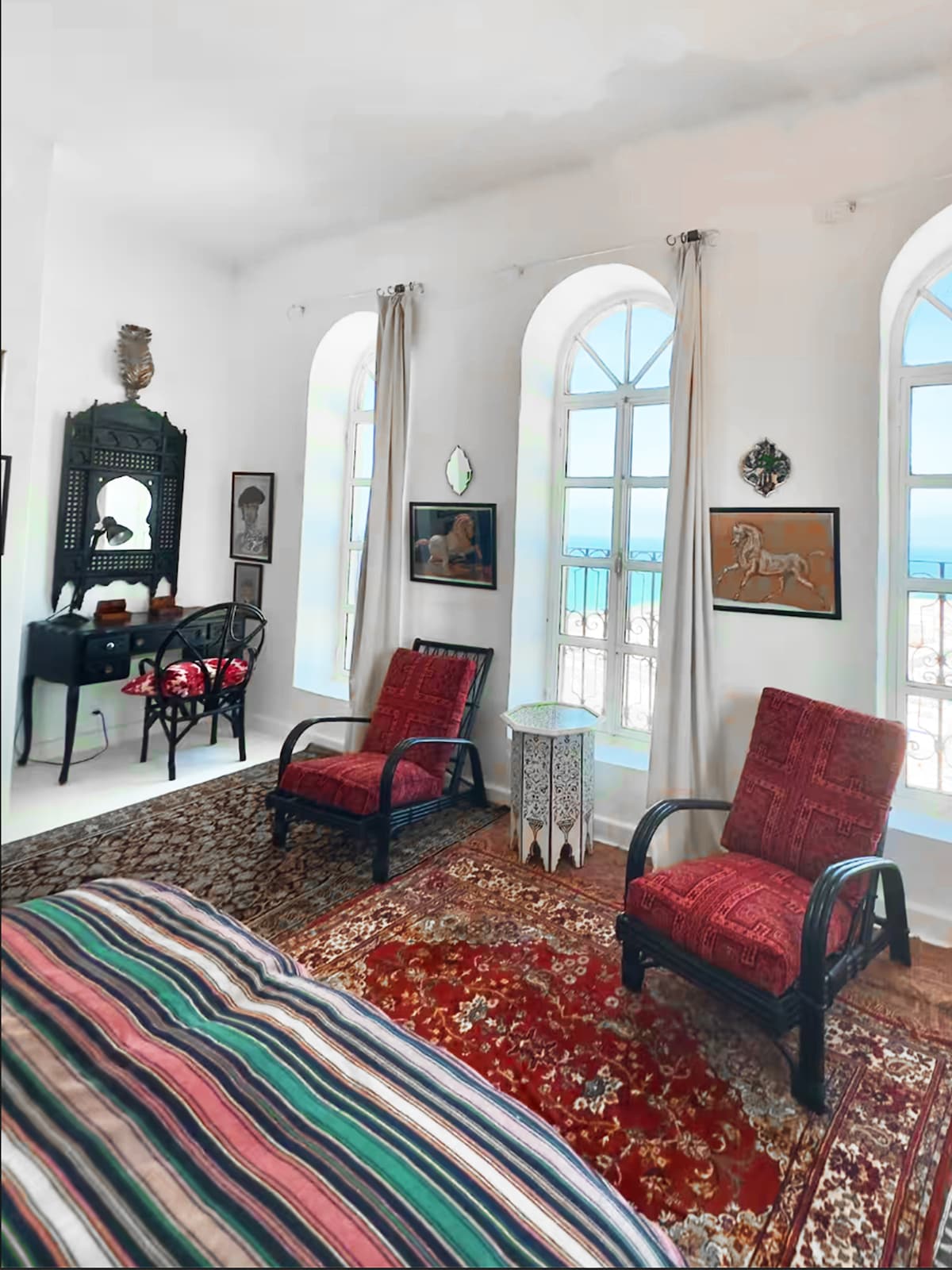C'est une splendide maison de style Hispano-mauresque, des années 30. Élégante, spacieuse, inondée de lumière et de soleil. Sans vis à vis, elle domine la Casbah, la baie de Tanger, le Détroit, Gibraltar et l'Espagne : le face à face avec le site et les éléments est ébouriffant. Dépaysement total : déjà l'Orient, encore l'Europe. De cette maison vous rayonnez partout : la médina, la ville et les environs : plages, resto, balades.