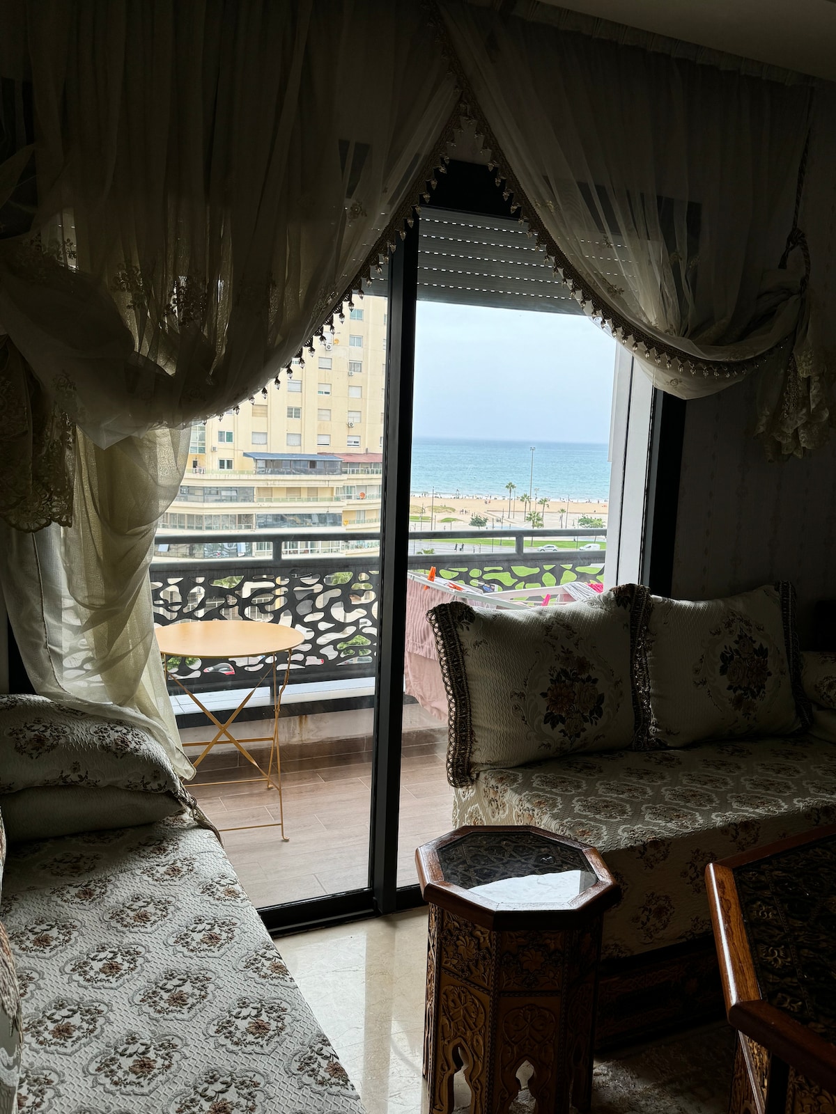Enjoy luxurious accommodation in the heart of Martil, just 1 minute from the beach. 100MB fiber optic, Smart TV, and newly furnished. Quiet and prestigious building. Guide for activities, restaurants, and tourist attractions available. Contemporary comforts and close to all amenities. Maximum 5 people with one double bedroom, one bedroom with 2 single beds, 2 sofa beds, and a very well-equipped kitchen. Marriage certificate required for Moroccan couples.