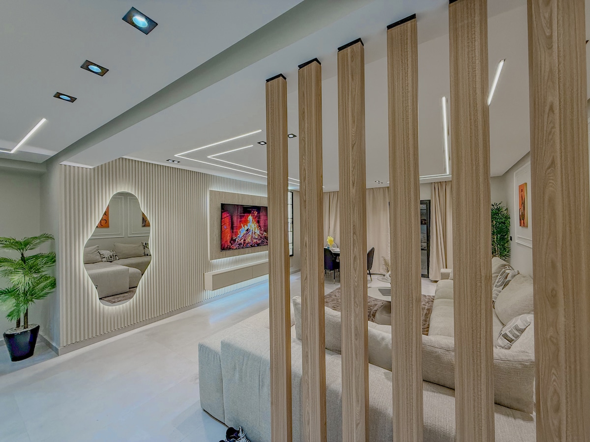 Villa de lujo con piscina grande privada auto-limpiante a 5 km de Cabo Negro y a 3 km del aeropuerto de Tétouan y McDonald’s. Con 2 habitaciones y 2 salones (uno con 4 sofás cama) para 8 adultos, cocina equipada, baño modernos, jardín con iluminación que se enciende al atardecer, zona de barbacoa y parking para 3 vehículos. Limpieza y mantenimiento garantizados. No se permiten fiestas , solo huéspedes respetuosos. Incluye climatizador automático