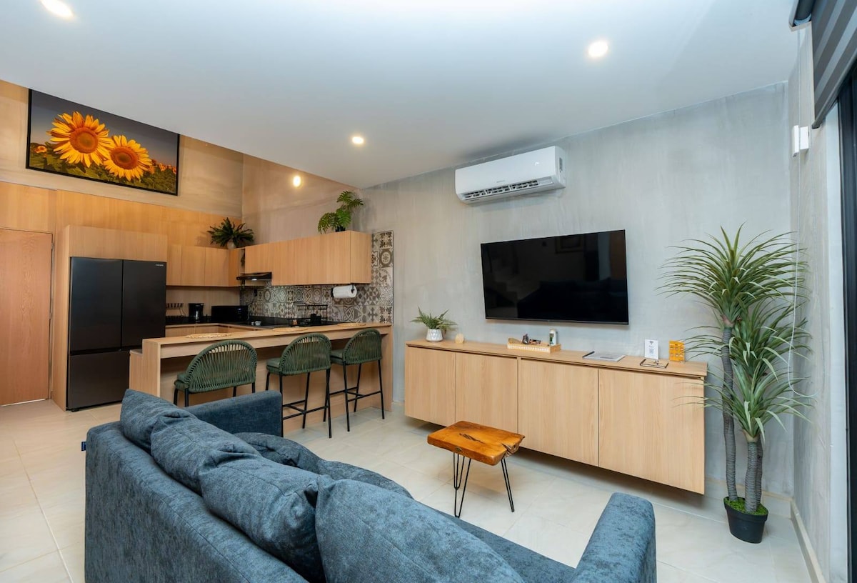 Un departamento fresco y moderno para unas vacaciones inolvidables con la familia o para trabajar en smart working. Decorado con detalles preciosos que te harán sentir como en tu propia casa. Equipado y con servicios de alta calidad: internet 200mbps, lavadora/secadora, smart tv, agua caliente y aire acondicionado. Se ubica a 2 minutos caminando de la playa Santa Cruz y cerca de restaurantes, tiendas y mercados. Además cuenta con un rooftop común desde donde se alcanza a ver el océano.