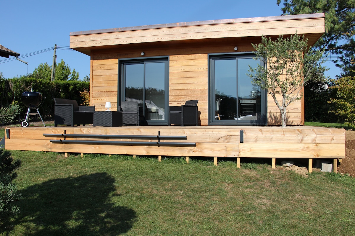 Petit chalet "Le Cabouë" au calme (18m2 + mezzanine) Lit 160 sur mezzanine Haut < 1,80 SdB avec douche lavabo WC (sèche cheveux) Coin kitchenette avec micro onde réfrigérateur hotte aspirante plaques induction 2 feux lave vaisselle 6 couverts TV : Canal +, Netflix, Apple TV Terrasse sud mobilier de jardin Spa extérieur gratuit pour 1/2 heure de 17h30 à 20 h Connexion internet gratuite Parking privé pour une voiture Petits déjeuners offerts Linge de toilette fourni Lit fait à votre arrivée