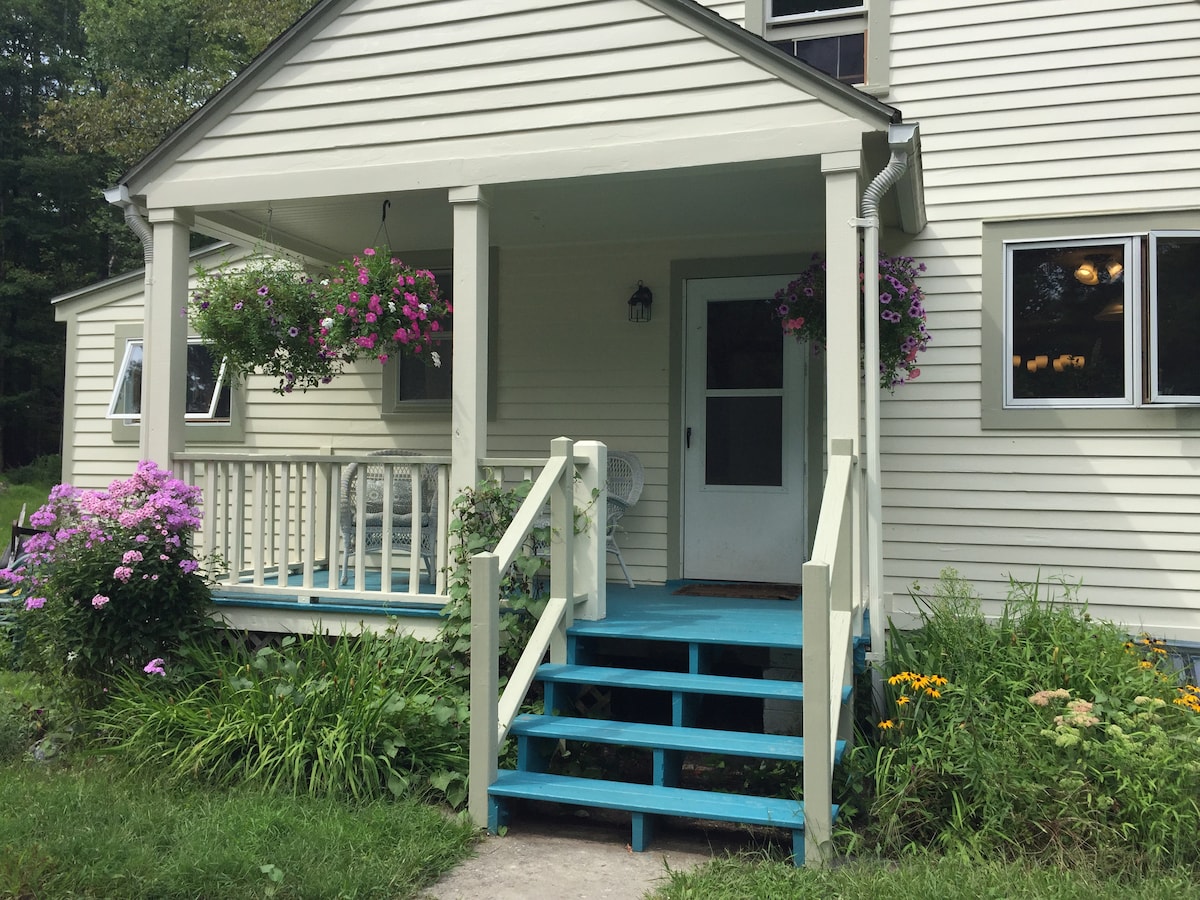 Modern Scandinavia-style riverfront bungalow on 8 acres. Sit on your deck with twinkle lights for coffee/dinner filled w sounds & views of a rushing river; walk across the river into your own private swimming spot! Perfect for a nature retreat, hiking, swimming, fishing (stocked every April), skiing, work w mountain views or write that novel you have always wanted to finish. 2 hrs from the George Washington Bridge. Level 2 EV charger. Hate has no home here-all are welcome.