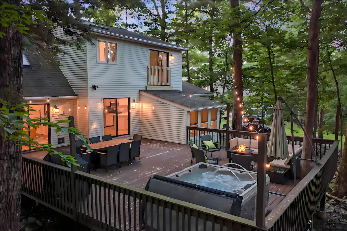 Enjoy this stylish Poconos cabin located a short distance from multiple lakes, skiing, and golf courses.. (please note Lake Naomi is PRIVATE and we dont have a membership) → Smart TV → Solid WiFi → Fully Equipped Kitchen → Hot Tub → Fire pit & Awesome Deck → 13 miles from Snow Ridge Village → 3 miles to Timber trails and Pinecrest Lake Gold Course → 10 mins to Kalahari Waterpark/waterfalls → 20 mins to Camelback Mountain Adventures STR Permit Number #020578 Minimum Age to Rent: 25