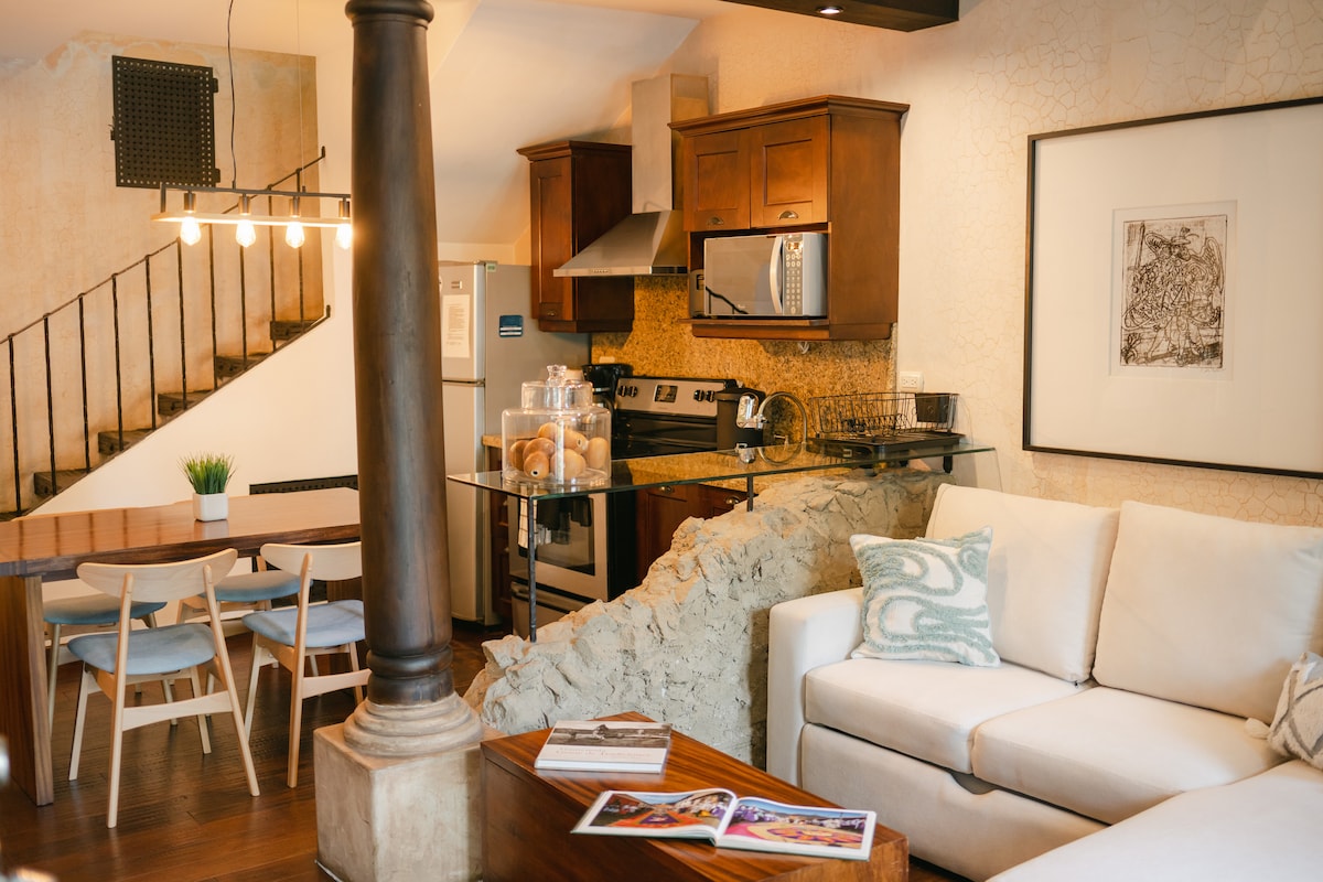 Disfrute de nuestro cómodo loft ubicado en el centro de Antigua, a tan solo 60 mts del parque central. Cuenta con la mejor ubicación en la ciudad, descubre lo mejor de Antigua con comodidad y estilo al alcance de tus manos. El espacio bien diseñado incluye cocina - comedor, sala de estar y lavandería en el primer nivel, con un tranquilo dormitorio y un moderno baño en el mezzanine. El loft cuenta con wifi de 250 megas. Ofrecemos parqueo gratis en un parqueo privado a 7 cuadras del loft.