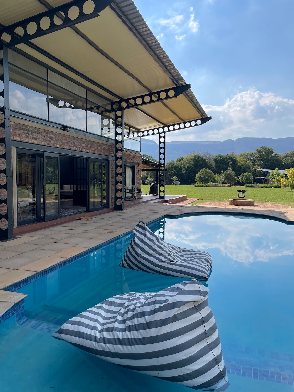 Unwind in a wood-fired hot tub with sweeping Magaliesberg views in Hartbeespoort, then cool off in the pool. A striking glass home with fire pit, braai and full solar power — just 45 mins from Johannesburg & Pretoria. Spacious, modern and immersed in nature. Ideal for couples, birthdays, anniversaries or a peaceful escape to start the year right.