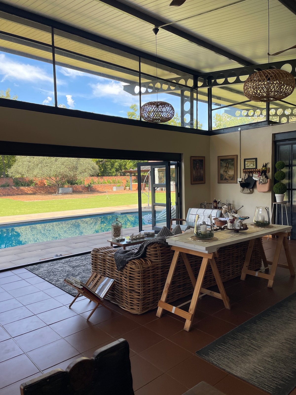 Escape to our charming one-bedroom log cabin in the heart of Hartbeespoortdam. Designed with a cozy Bohemian touch, our cabin is perfect for exploring the beauty of Hartbeespoort. After a day of adventure, unwind in an open-plan living space, with a kitchen, air conditioning, and free WiFi. Relax on the spacious patio, take a dip in the swimming pool, or simply soak in the suburban surroundings. Centrally located with a separate entrance and undercover parking.