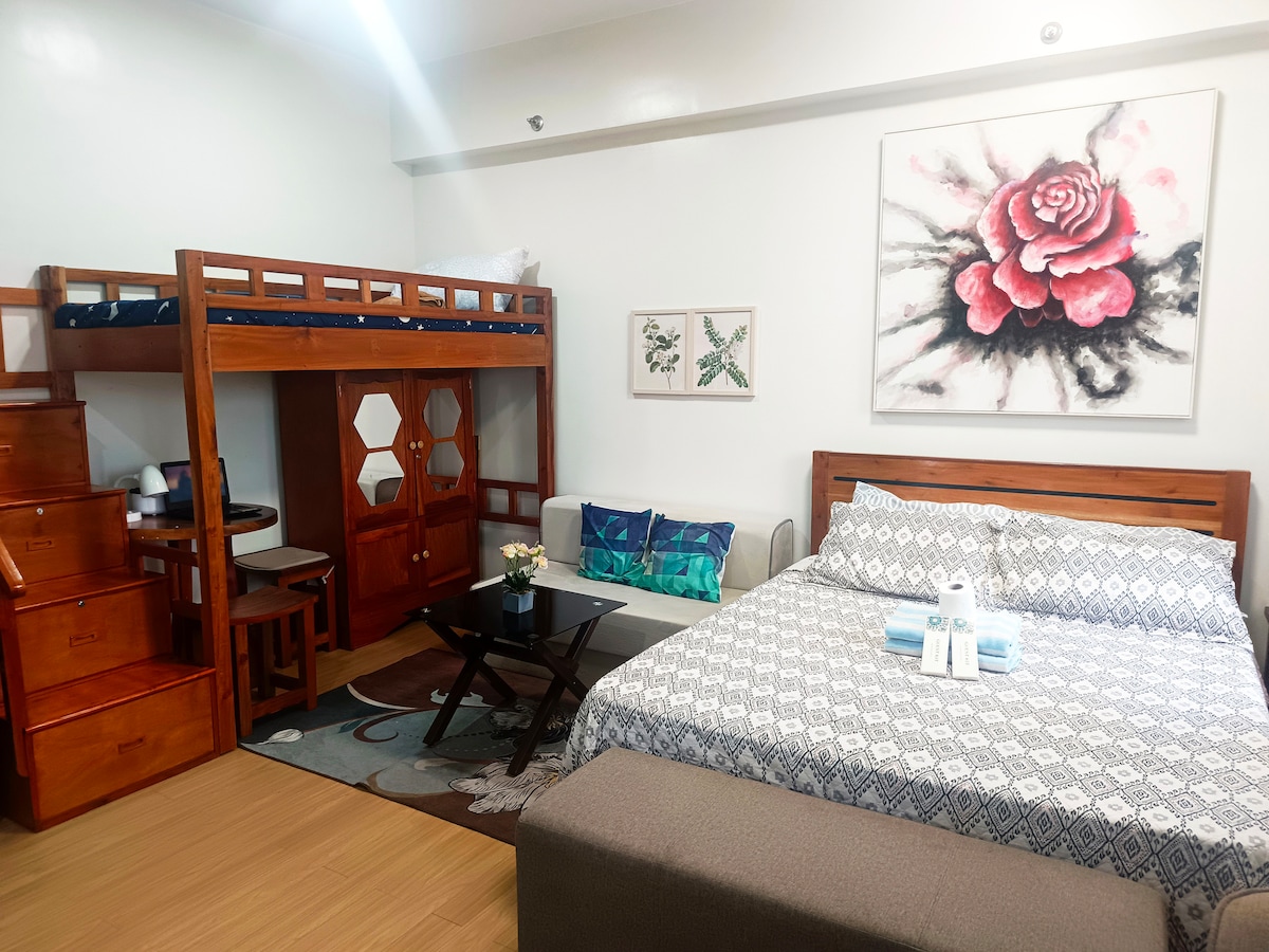 Forget your worries in this spacious and serene space. Studio Flat with own balcony, bathroom, hot/cold water, long dining table, hallway to relax and rooftop to unwind, basketball court, badminton, and can jogging. Quiet place away from the city, 24/7 Security and CCTV. Fully Furnished, induction can cooked light food, for heavy gastove by request with fee, microwave, ricecooker, refrigerator,Aircon,wifi,utensils,television,towel, shampoo, soap. We served food as a request in advance with fee