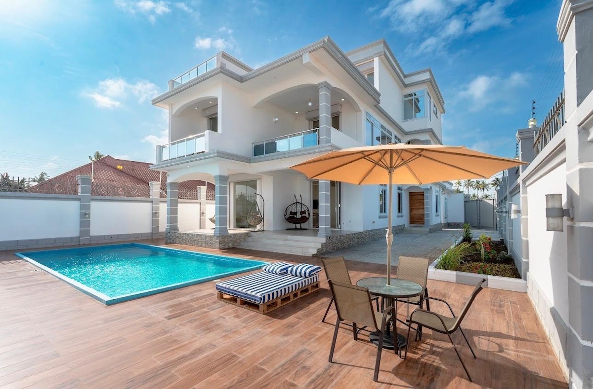 A luxurious tropical getaway on Zanzibar's serene west coast. Our spacious villa, perfect for families, offers breathtaking Menai Bay views, four ensuite bedrooms, indoor and outdoor kitchens, and a stunning oceanfront pool. Enjoy modern amenities like air conditioning, smart TVs, WiFi, and a PlayStation. Relax in our solarium in front of the outbreaking ocean view. Just 15 minutes from Zanzibar Town and 20 minutes from the airport, Enjoy your ultimate escape from the hustle and bustle.