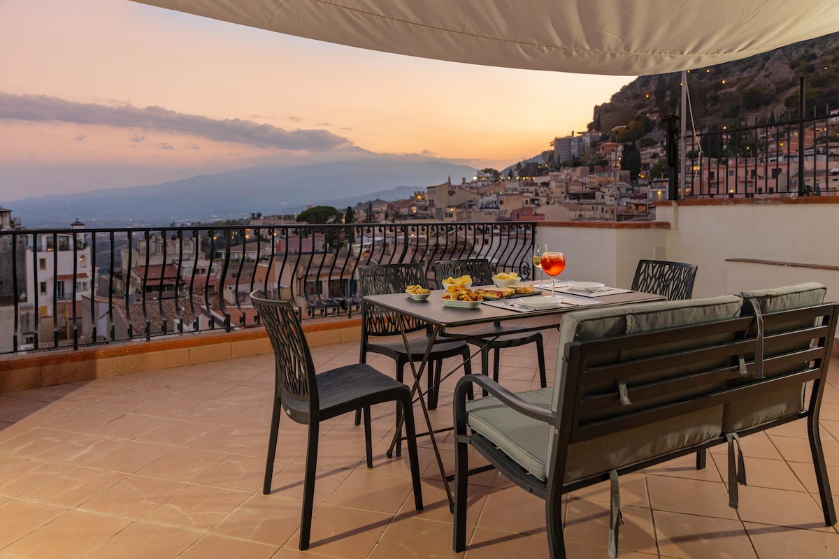 Etna Apartment is a small, well-furnished 28 sqm studio apartment composed of a single room with kitchenette and a small toilet with shower. It is surrounded by a large panoramic terrace of 65 sqm where you can admire the beauties of Taormina: Etna, the bay of Giardini Naxos and Castelmola. Etna Apartment is a 5- minute walk from the historic center of Taormina. It is the ideal place for couples, and no, who want to spend a romantic and unforgettable stay.