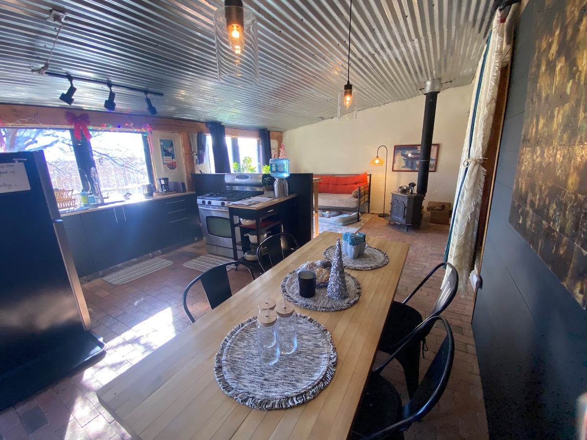 This remodeled guest house is an upcycler's dream. A unique and tranquil getaway is nestled 25 minutes from Taos Ski Valley and 10 minutes from Taos Plaza. Situated at the back of the main residence, an Earth ship, you’re sure to have a local's feel, and quiet getaway! Sleeps three comfortably, one king bed in the master, a daybed in the main living area. Plenty of room to spread out in the kitchen-dining area. Not suitable for children. Sunroom and loft coming this summer!