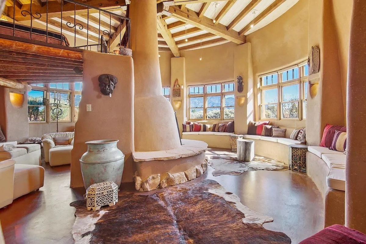 This Earthship is great for experiencing a home that is quiet, serene, romantic, private, (one acre lot) surrounded by acres of sagebrush and chamisa. and is only 15 minutes from town. The inside is dark adobe with gold straw, with flagstone floors, and rustic Sycamore Oak beams. 3 kivas fireplaces too! It's been used as a recording studio too, If you like taking awesome photographs, this is THE place. Cozy, comforting! Pets are welcome and must be leashed! Cat box provided by request!