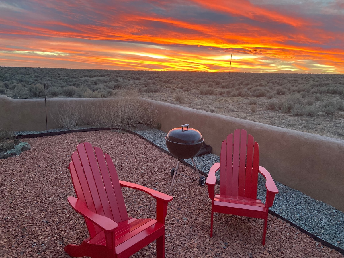 Re-energize in the high desert! This Earthship retreat surrounds you with adobe curves, solar power, lux finishes and endless skies. Wake to quiet sunrise views + End your day with incredible stargazing in dark sky country. Inside you'll find • 2 comfy queen beds with cozy bedding • Fully equipped kitchen • Fast Wifi • BBQ grill + Fire pit area • Dedicated workspace + Board games • Tub + Rain shower Unplug without sacrifice! 15 minutes to Taos, 45 minutes to Taos Ski Valley yet worlds away!