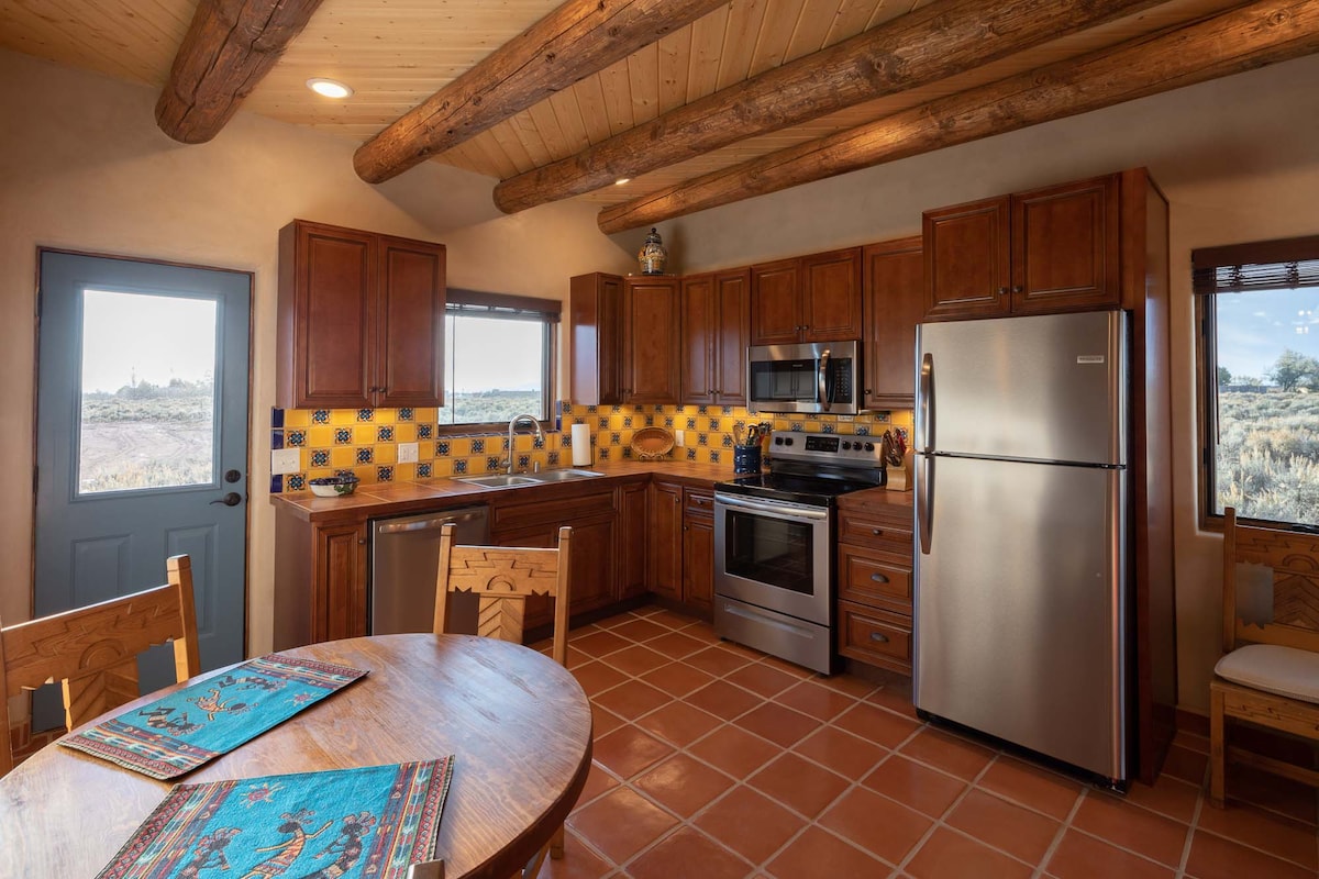 Sunny & Bright Guesthouse with amazing sunset views and stargazing from your private patio. One bedroom one bathroom with open concept living area opening to huge private patio with grill & dining. 15 minutes to world class skiing at Taos Ski Valley or 15 minutes to shopping and dining in the historic town of Taos. This guesthouse shares over 4 acres with the main house. A beautiful farm setting to enjoy evening sunsets and starry night skies. It has everything you need for a pleasant stay!