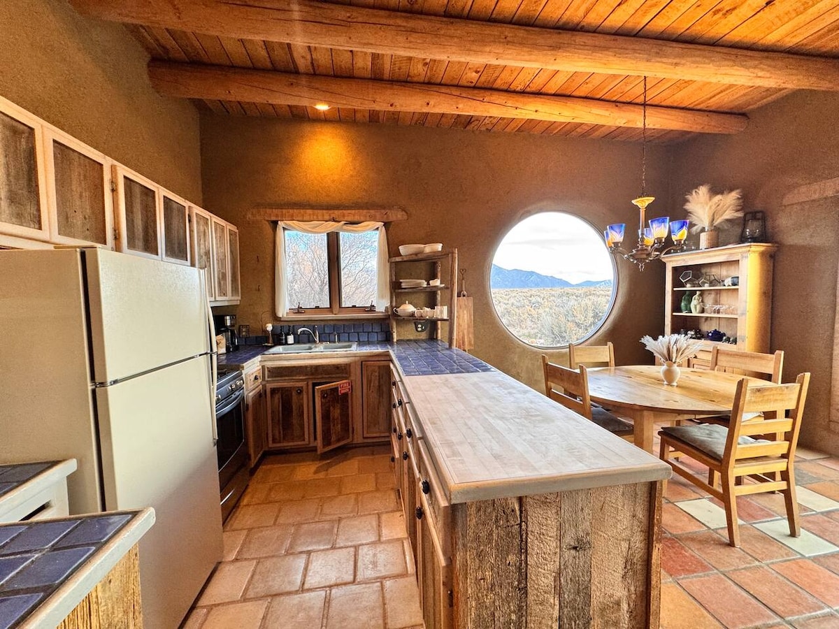Re-energize in the high desert! This Earthship retreat surrounds you with adobe curves, solar power, lux finishes and endless skies. Wake to quiet sunrise views + End your day with incredible stargazing in dark sky country. Inside you'll find • 2 comfy queen beds with cozy bedding • Fully equipped kitchen • Fast Wifi • BBQ grill + Fire pit area • Dedicated workspace + Board games • Tub + Rain shower Unplug without sacrifice! 15 minutes to Taos, 45 minutes to Taos Ski Valley yet worlds away!