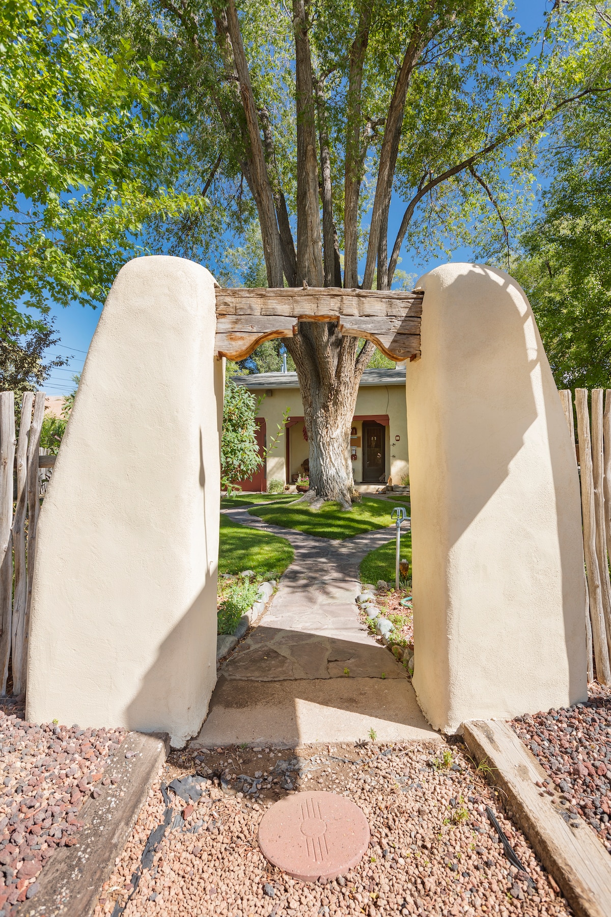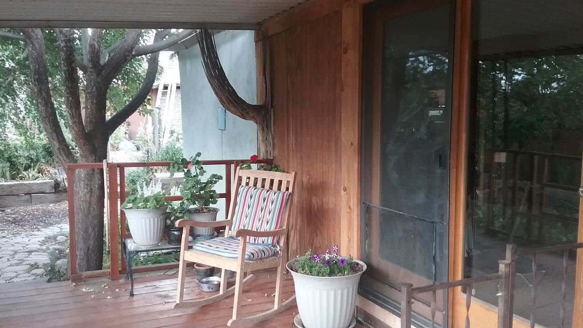 At Taos Lodging we offer you 8 sweet and unique casitas set on a shady and secluded acre on quiet Brooks Street. Chamisa #6 is the end unit of our triplex, nearest the hot tub, with a fully equipped-kitchen and eating area, a porch with covered seating, easy access to the hot tub. It is ideal for dogs and sleeps 4 - 900 sq. ft. Our casitas have wood floors w/ some carpet in the bedroom area - if creaky floors are going to bother you or your sleeping companions - we are not your spot to land.