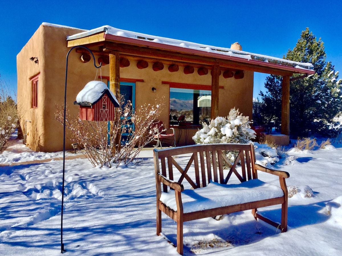 The best views in Taos--mountains all around. A truly private and impossibly romantic getaway. Traditional adobe casita with vigas and latillas, on a paved road, at the edge of the mesa overlooking town. Only three miles to the Plaza, easy access to Taos Ski Valley, the Rio Grande Gorge, Ranchos, and the road to Santa Fe. Speedy fiber optic internet for digital nomads. Sunrises and sunsets are spectacular. We offer a great experience--just look at all the wonderful reviews by our awesome guests!