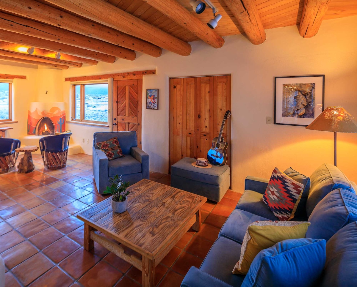 Amazing Views, Peaceful, and Close to Skiing & Plaza Step into an authentic adobe with warm southwestern charm and relax in tranquility. This newly remodeled guesthouse has high viga ceilings, kiva fireplace, heated satillo tile floors, and wooden furniture made by local Taos artisans. Located on 1.5 acres, adjacent to endless Pueblo land, enjoy spectacular Mountain views from your private upstairs patio and downstairs deck. Just 10 minutes from downtown and 20 minutes from the Taos Ski Valley.