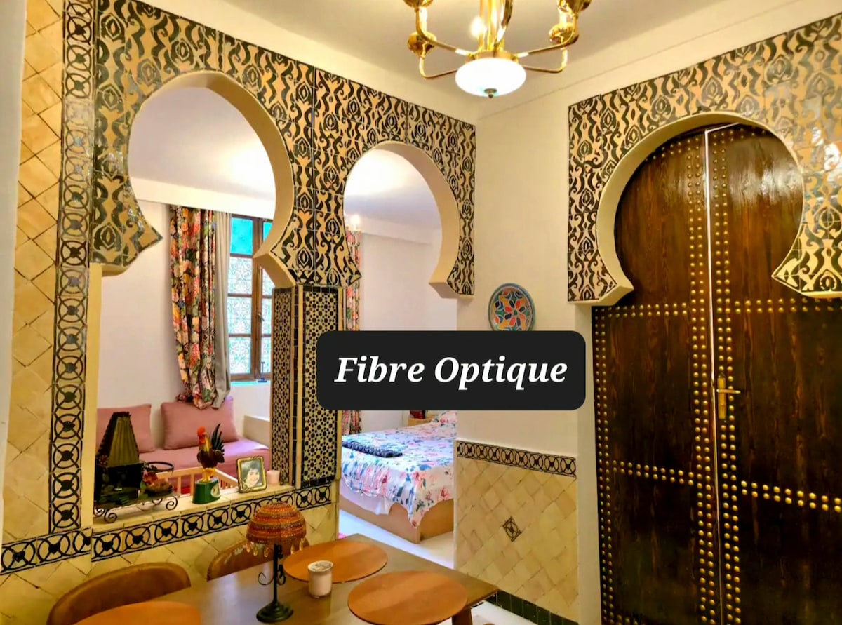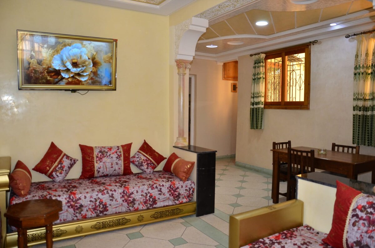 apartment located on the first floor of a clean and secure building, at the entrance of the old city of Fes. The apartment boasts an ideal location, combining tranquility and privacy, away from the noise and hustle of the medina, while still being close to all essential amenities such as shops, restaurants, and public transport. A perfect choice for those seeking an authentic experience in a calm and comfortable setting.