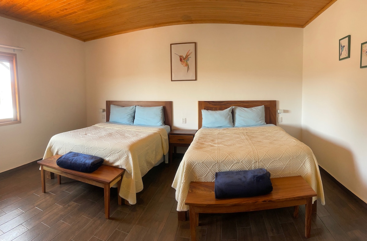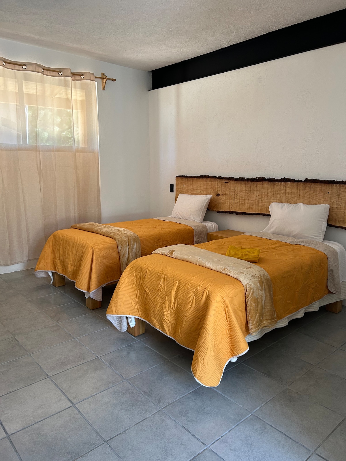 Estancia de una habitación de hotel para 4 y hasta 12 personas, cuenta con un cuarto de servicio privado que tiene tres regaderas y dos wc. No tiene cocina, pero al rentar mínimo tres habitaciones (25 personas) se les puede prestar una cocina y comedor que están en un área cerca de la estancia del Hotel BIMORI.