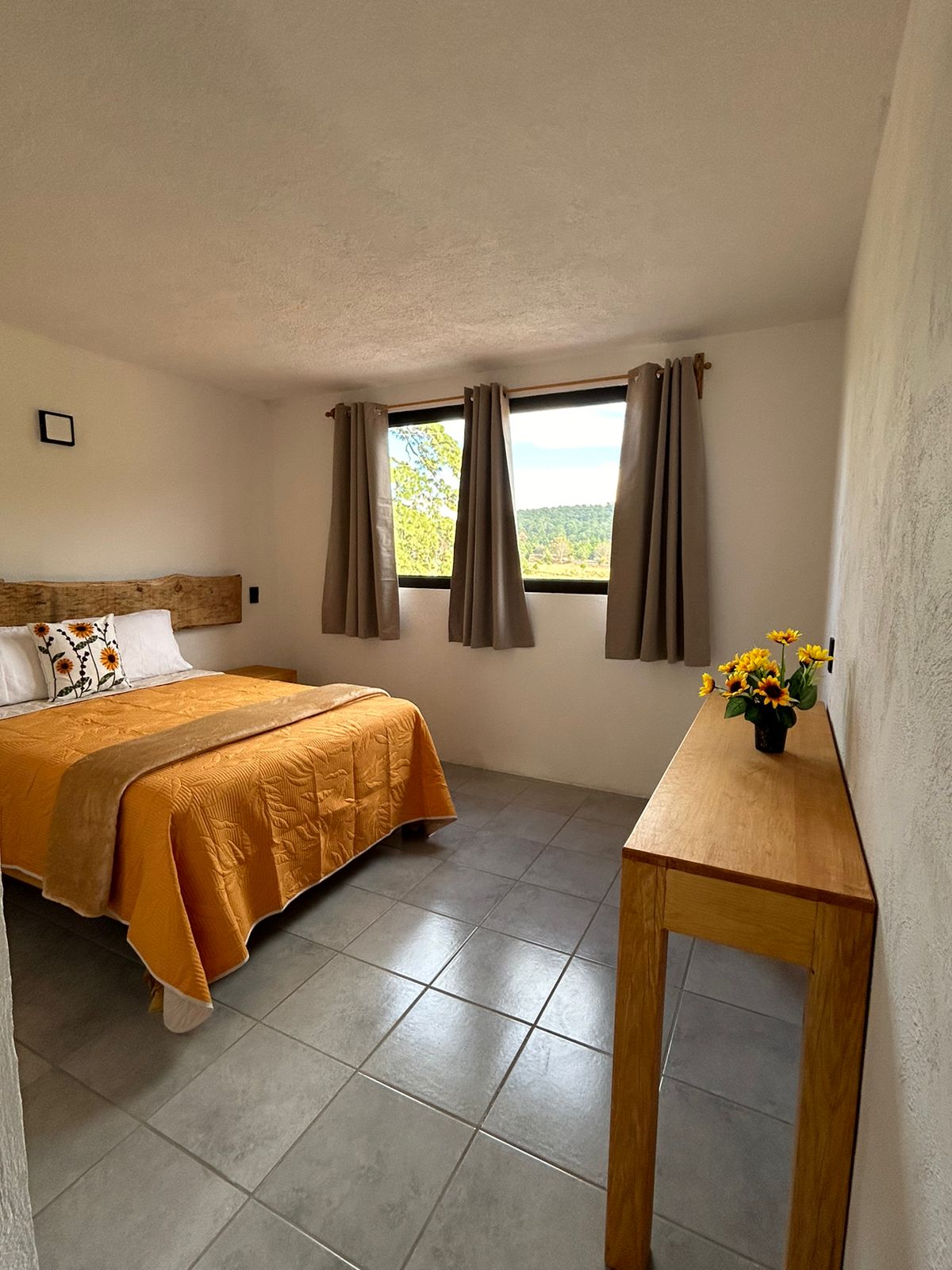 Acogedora habitación de hotel en el centro de Tapalpa, disfruta la experiencia de hospedarte en un ambiente cálido y rústico a pocos metros de la plaza principal del pueblo.