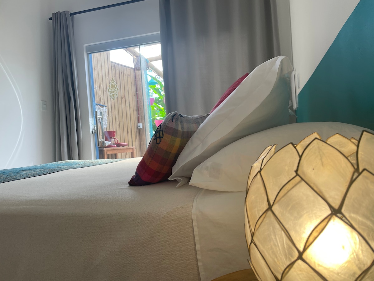Nossa suíte privativa para casal combina conforto, beleza e uma atmosfera artesanal única. O espaço foi pensado para oferecer dias de descanso e bem-estar, cercado por um quintal arborizado, repleto de árvores, jardim e piscina. Na suíte: Banheira privativa Ar-condicionado Ventilador de teto TV Cama casal Decoração boho chic E o melhor: estamos a 500 metros da praia, em uma região silenciosa, segura e encantadora.