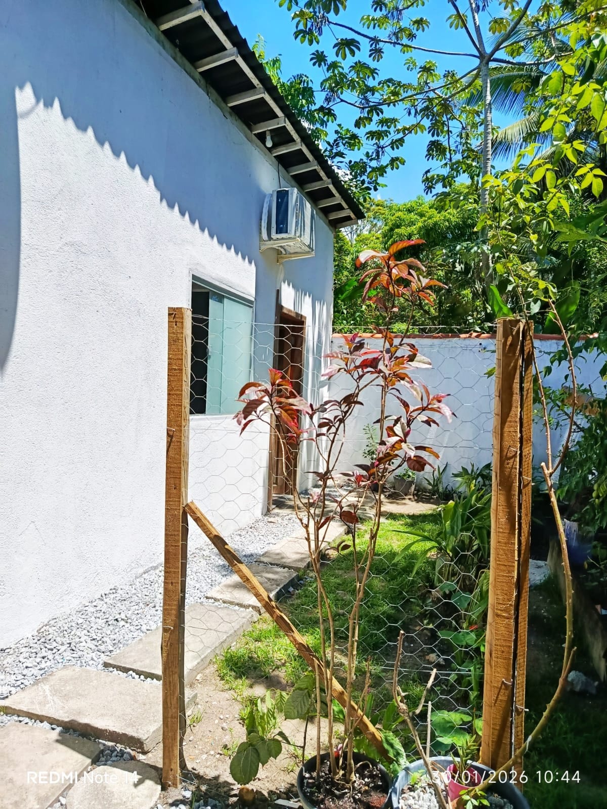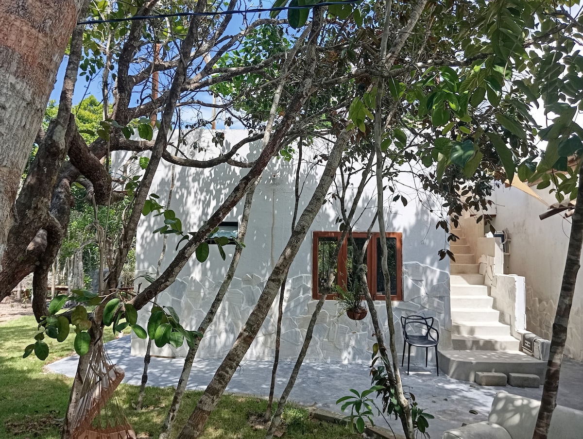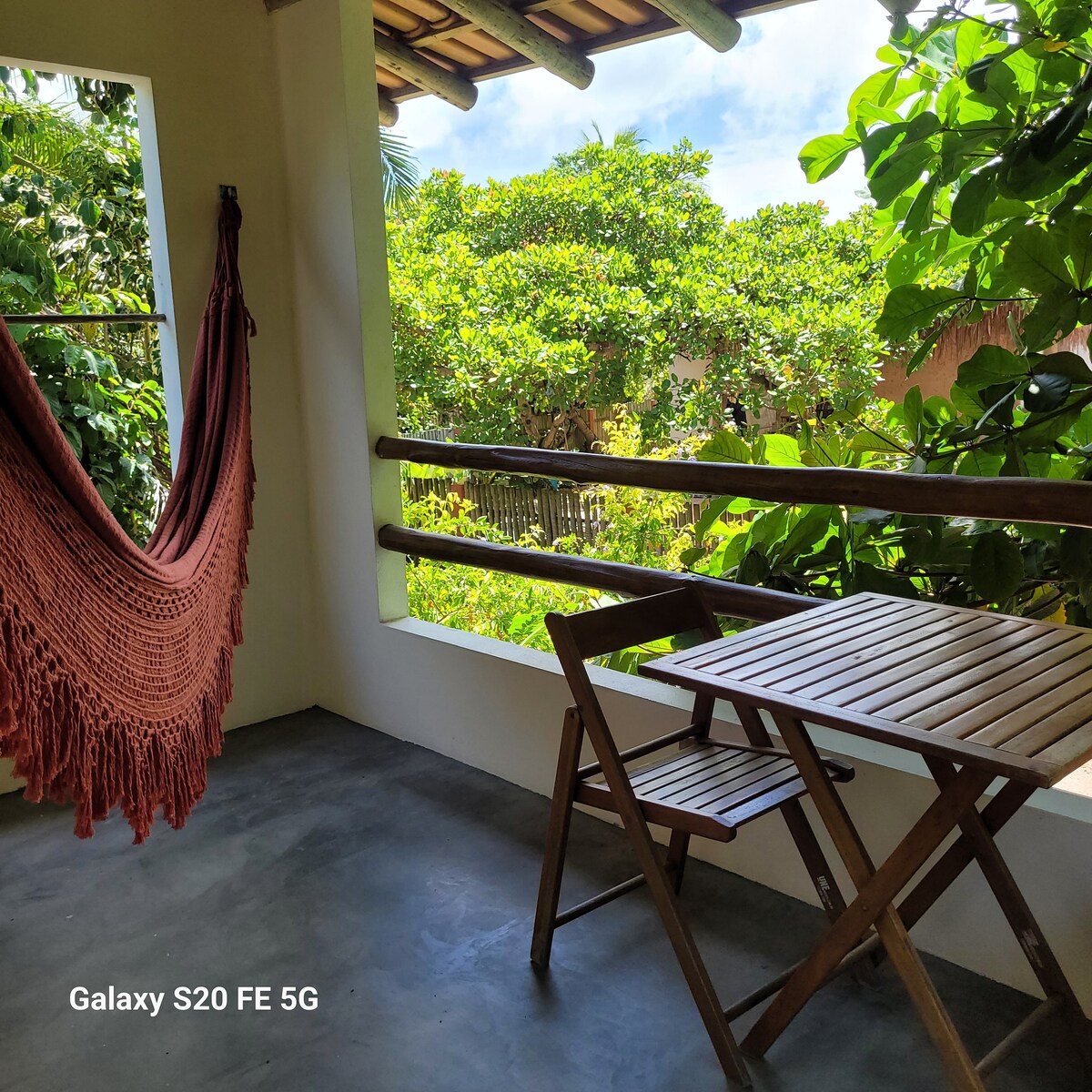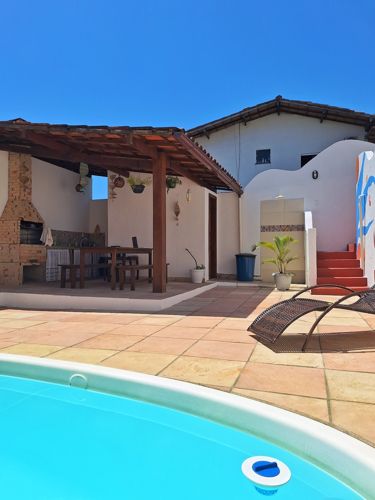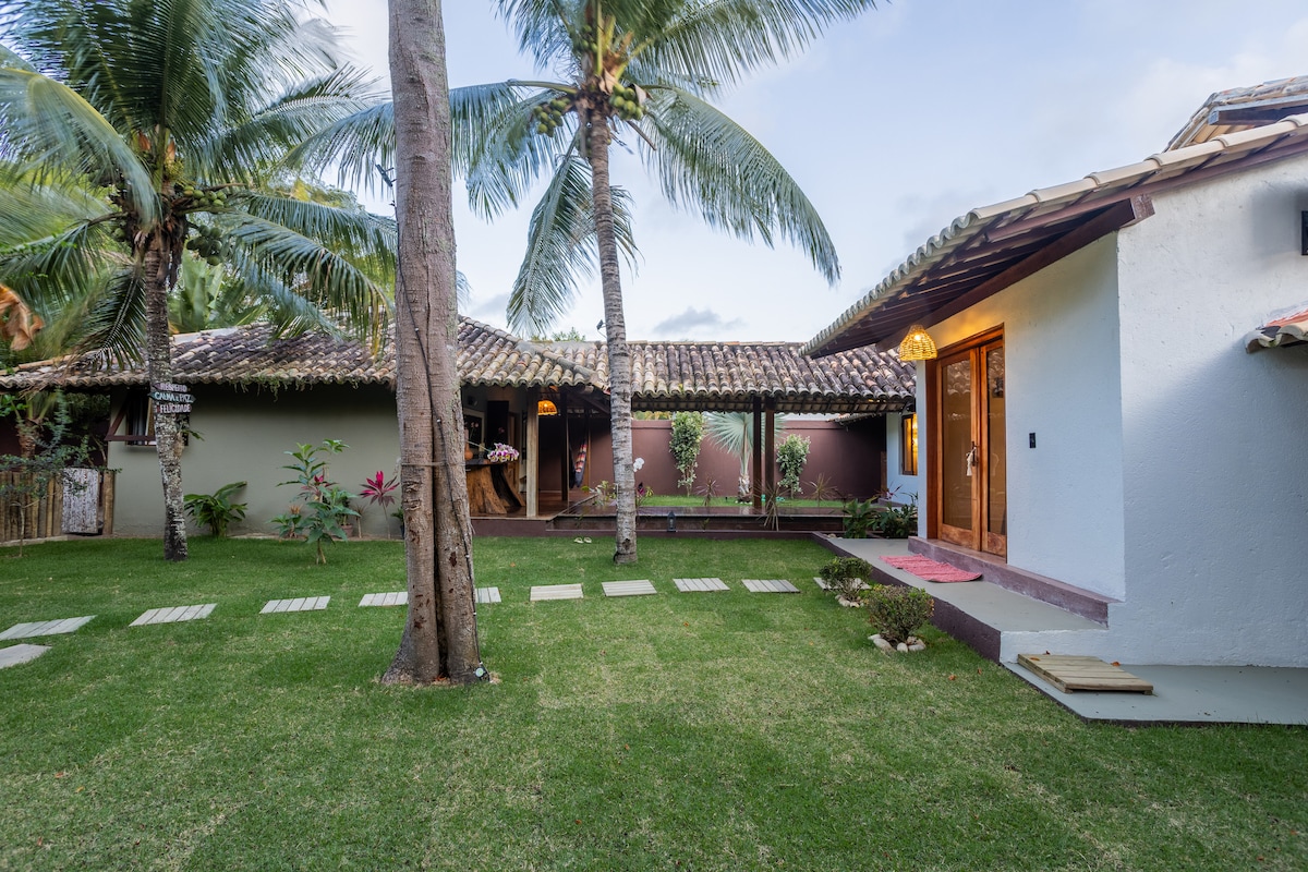 Uma acomodação aconchegante com um jardim amplo, repleto de plantas diversas. Pela manhã os hóspedes são despertados pelo canto dos pássaros. Uma piscina convidativa, ideal para um mergulho refrescante. O local esta próximo ao mar, facilitando o acesso a praia. Na varanda a rede esta disponível para um descanso em um ambiente tranquilo e confortável.