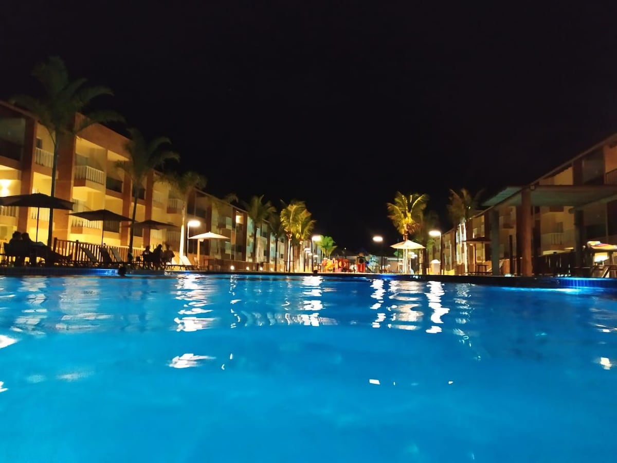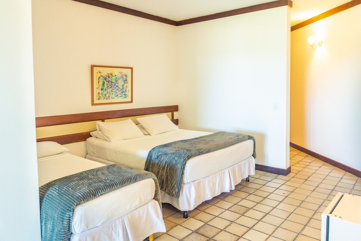 Quarto dentro do Portobello Park Hotel administrado pela JL Temporadas, com área de lazer que compõe: Recreação Toboágua infantil e adulto Campo de Futebol Quadras 3 Piscinas salão de jogos e muito mais.... Café da manhã é a parte e pode ser solicitado no momento do checkin. Ficamos a menos de 400 m da praia de Taperapuan e da Barraca Axé Mói, além de bares e restaurantes a pouco metros e de dois mercados na região