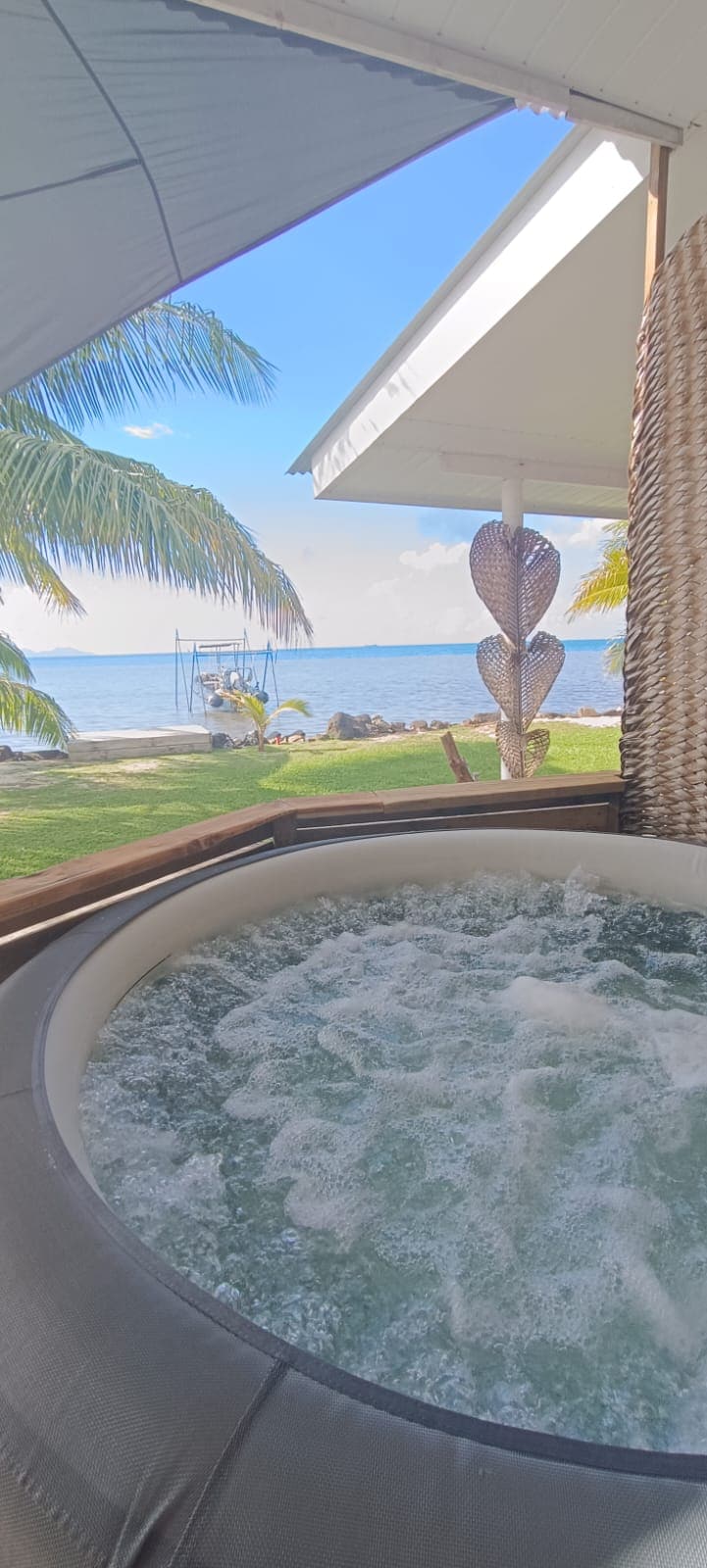 Dans un jardin fleuri, entouré de jeunes arbres fruitiers et de palmiers, un espace de 800 m2 vous accueillera pour vous installez. Le site étant en bord de mer, vous pourrez admirer les couleurs du lagon et du ciel aux couchers et levers de soleil avec ses îlots et une vue imprenable sur l’île de Bora Bora. Appréciez l’espace repas en commun où nous aurons le plaisir d’échanger avec vous. Nathalie et Hitinui 🌺😎