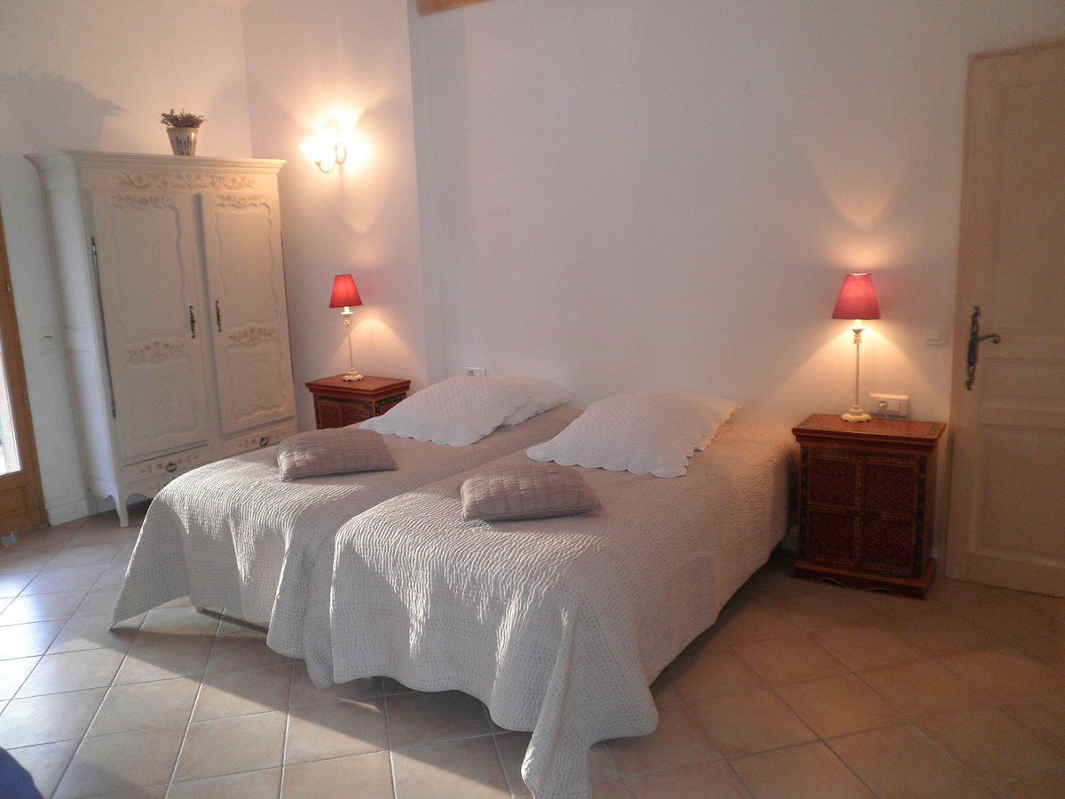 Bedroom located in our house, nestled on the heights of a small Provencal village in the middle of an olive grove with panoramic views of the massif of Sainte Baume. You will be quiet and can visit the countless villages of the Haut Var near the house. Your room of 25-square-feet has: - A private entrance - A queen-size bed 160x200cm - A bathroom with shower, bath, toilet and hair dryer - A functional and practical workspace (laptop table) - Dining area - Nespresso coffee machine and tea