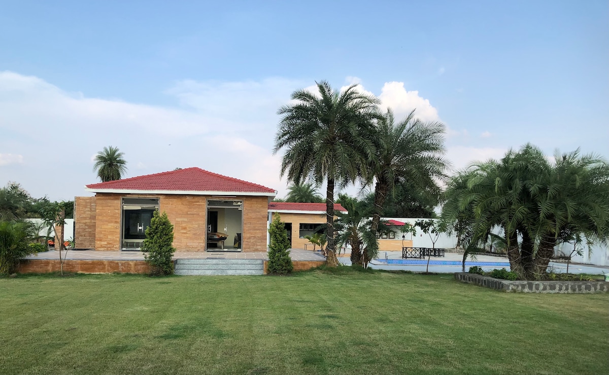 we have spacious rooms with changing rooms and clean and tidy washroom's attached and a big garden space with a pool, where you can get your peace at it's peak.