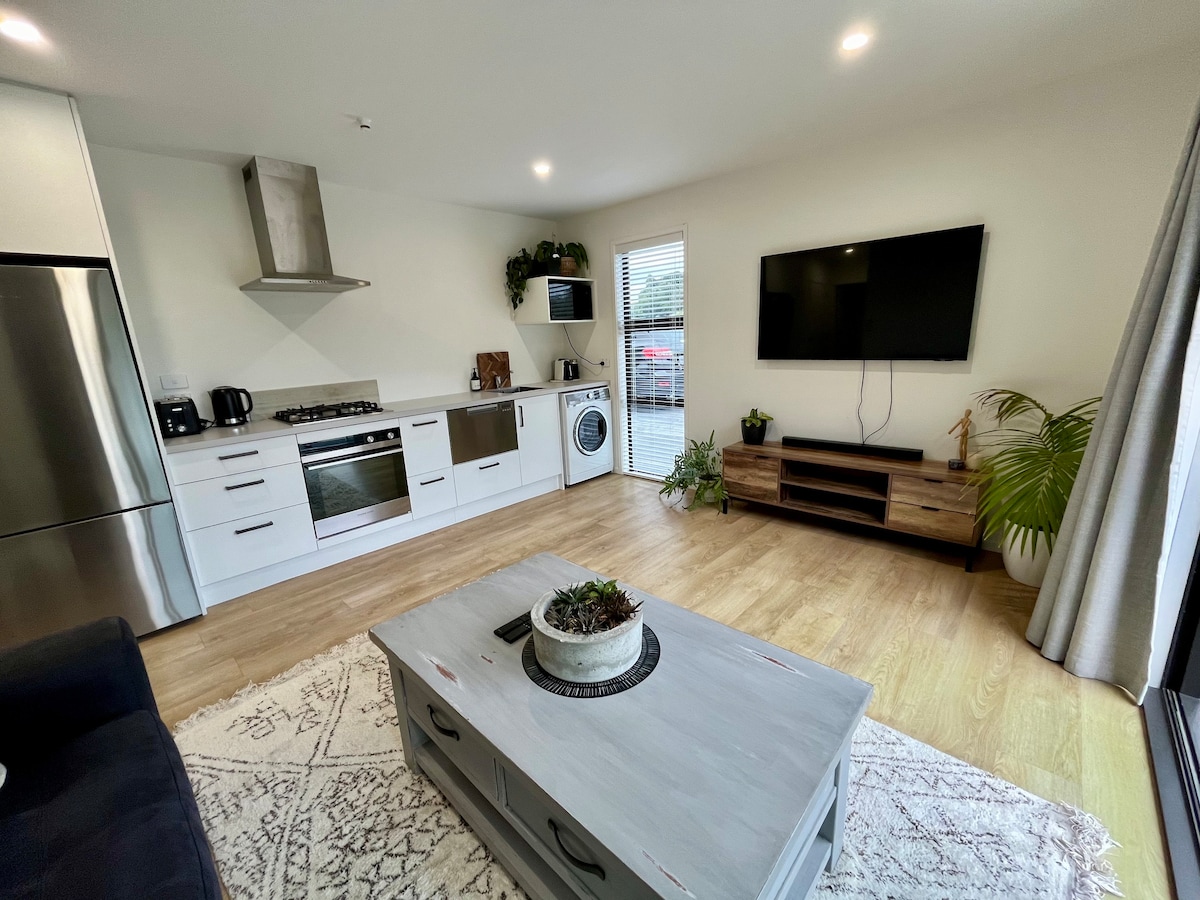 Enjoy a relaxing experience at this recently built cosy unit in suburban New Plymouth, and only a 5 minute drive from the centre of town. Get a great night's sleep on the comfortable queen size bed, relax on the sofa with some Netflix, get refreshed in the modern shower or catch a bus into town from the corner of the street. The location of this modern unit is also only a stone's throw from the beautiful local domain, featuring picturesque woodland walks and a popular swimming hole.