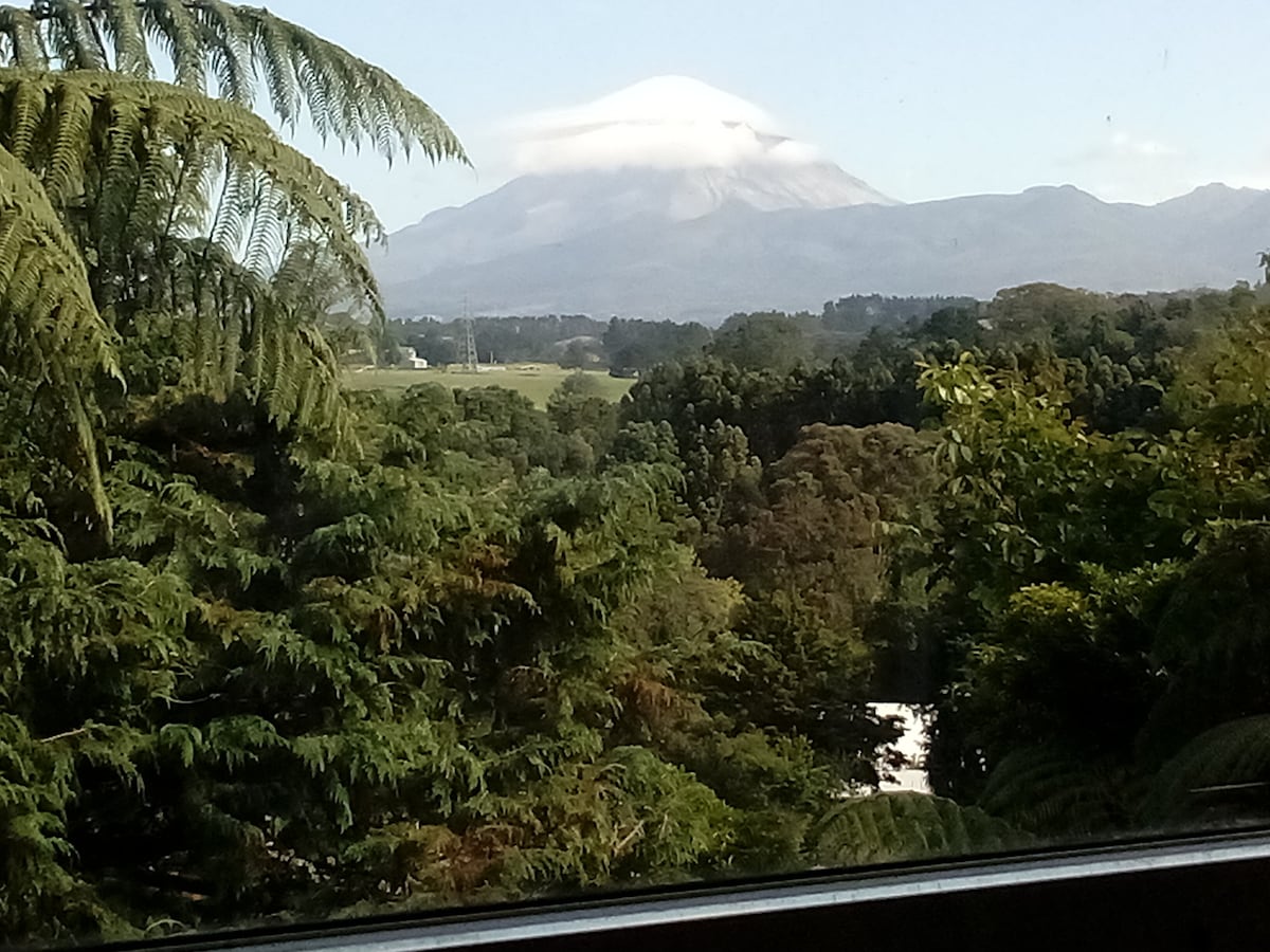 Spacious 2-bed house with 2 queen bedrooms and plenty of storage. Sorry - not suitable for children under 13 because of water sources. The owner lives in the shed in the back garden. Lounge overlooking the garden and pond. Full kitchen with cooker, oven, fridge-freezer, microwave and dining table and chairs. Close to base hospital, a 5 min drive into town or 8 mins to Pukekura Park for Womad and bowl concerts.