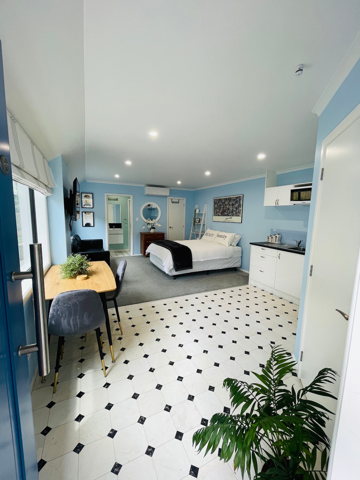 Kick back and relax in this calm, stylish space. The studio is separate, fully fenced, lovely and private. It includes a relaxing little Zen garden area. The TV has all of the subscriptions. The kitchenette has a microwave, toaster, Nespresso coffee machine, coffee pods, kettle & fridge. The stunning Oakura surf beach and Black Sand Pizzeria is just a 15 minute walk away, the cute little Oakura village, cafes and restaurants, a 12 minute walk away, and the Kaitake Ranges a 15 minute walk.