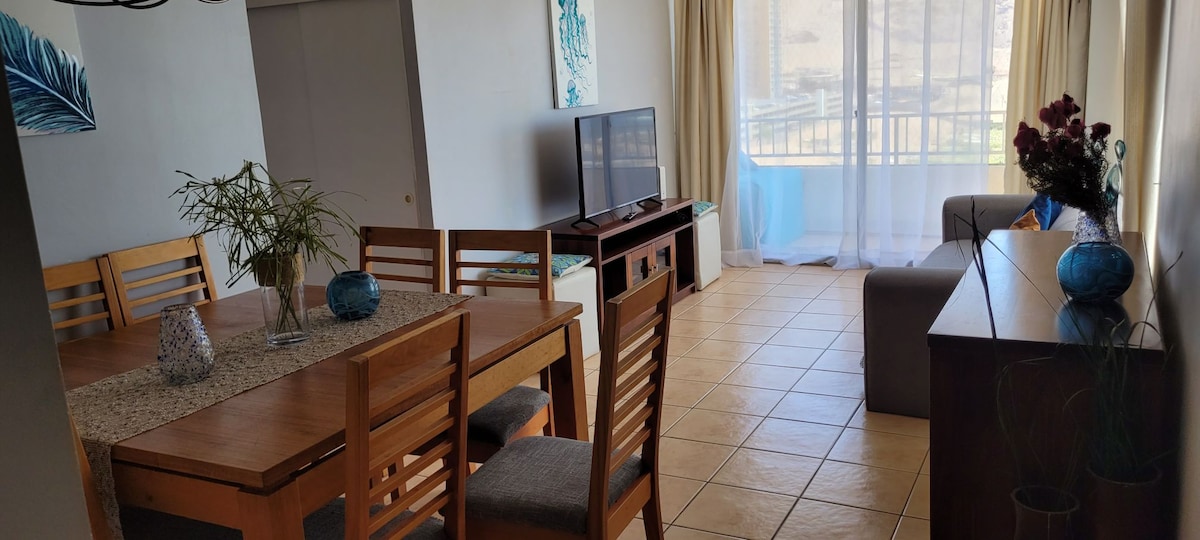 Lindo y luminoso Departamento con una vista inmejorable en primera linea, justo en la conexion de Playa Cavancha y Playa Brava de Iquique, podrás disfrutar de una cómoda estadía, con lugares turísticos cercanos, a pasos podrás encontrar restaurantes, pub, supermercados, estaciones de servicio, cafeterías, etc. Un lugar muy agradable, con estacionamiento incluido, equipado para una familia de 5 personas.