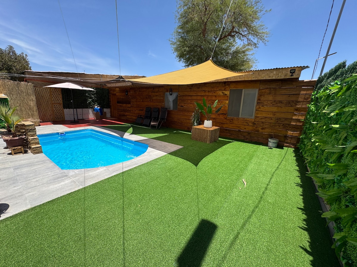 🌵Contamos con una acogedora y rústica cabaña representativa a la zona norte de Chile, con 3 habitaciones, dos baño, cocina, quincho y parrilla , piscina techada, cama elastica, taca taca, y juegos para niños. Lugar para hacer fogatas 🔥 y mirar un bello cielo estrellado y una maravillosa puesta de sol 🌅, a 5 minutos de la cocha (aguas termales terapéuticas) lugar ideal para relajarse y para quienes les gusta disfrutar la naturaleza y alejarse del ruido de la ciudad.🌵