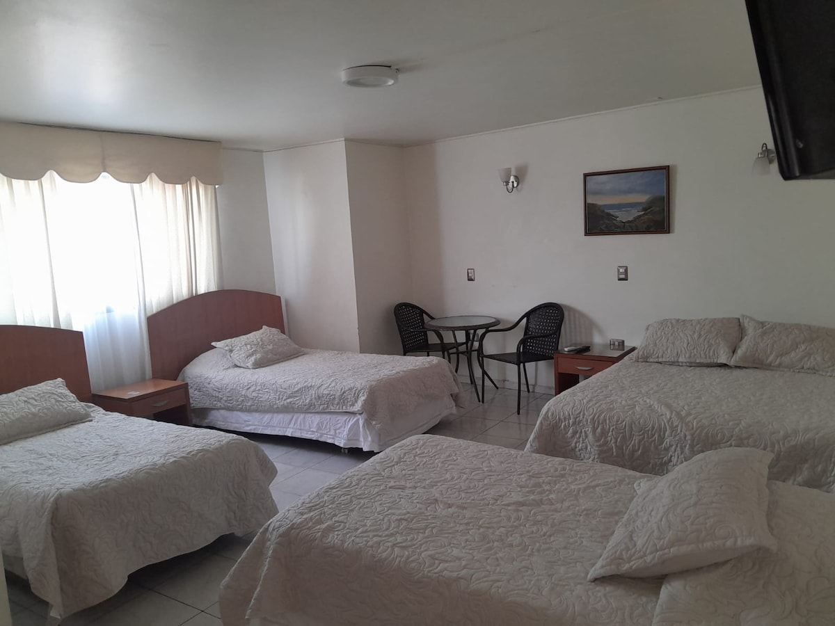 Perfecta para amigos o familiares, equipada con 2 camas individuales, baño privado, aire acondicionado, TV y WiFi gratis. Su excelente ubicación, cerca de Baquedano y Barrio Inglés, te permite moverte fácilmente por Iquique. Cada mañana disfruta de un desayuno buffet variado con frutas, pan, quesos y huevos preparados al momento. Limpieza y comodidad garantizadas.