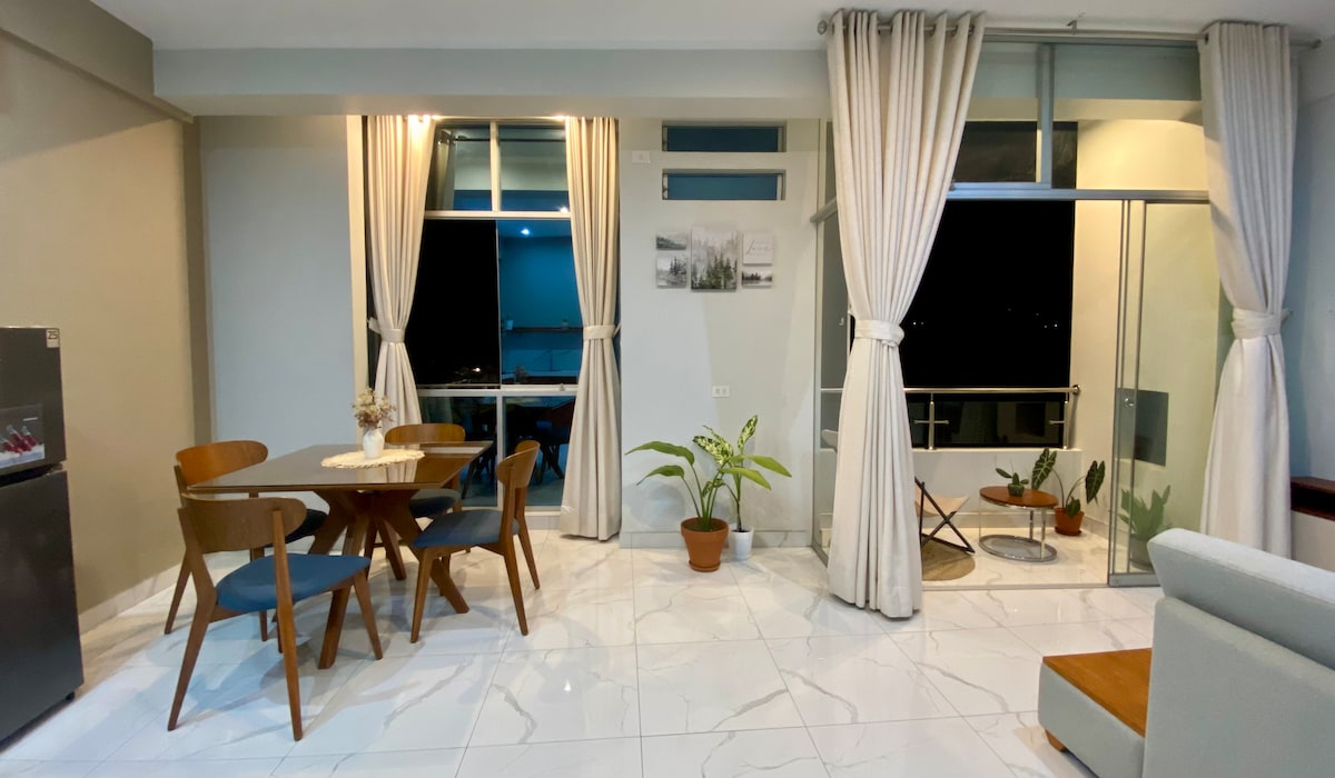 Hermoso, moderno y amplio departamento de 110 metros cuadrados en un condominio familiar, en esquina y con vista panorámica parcial de la ciudad y del aeropuerto de Tarapoto. Perfecto para una pareja o cuatro personas, además con amplio espacio para adicionar una cama. IMPORTANTE : - El precio publicado no incluye el aire acondicionado, este tiene un costo adicional de S/15.00 cada uno por noche, solo si es requerido.