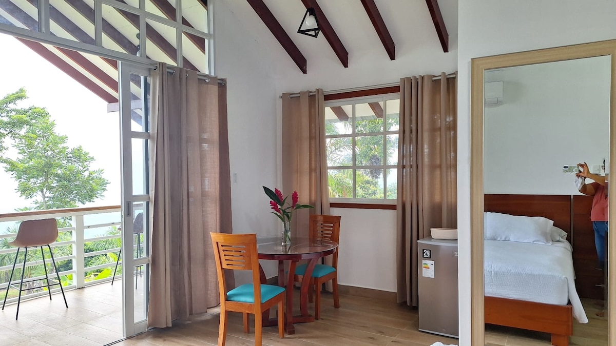 ¡Descubre la magia de la selva en nuestro Glamping! Diseñado para los amantes de la naturaleza, aventura y bienestar, con vistas panorámicas de la montaña. Relájate en una cama queen y disfruta de la terraza, hamaca aerea, el baño completo con ducha caliente, luz solar, cargador para celulares. Tiene wifi rapido de 6 am a 11 pm. La piscina y la cocina son de uso comun y en el comedor hay conexion de 220 volteos.