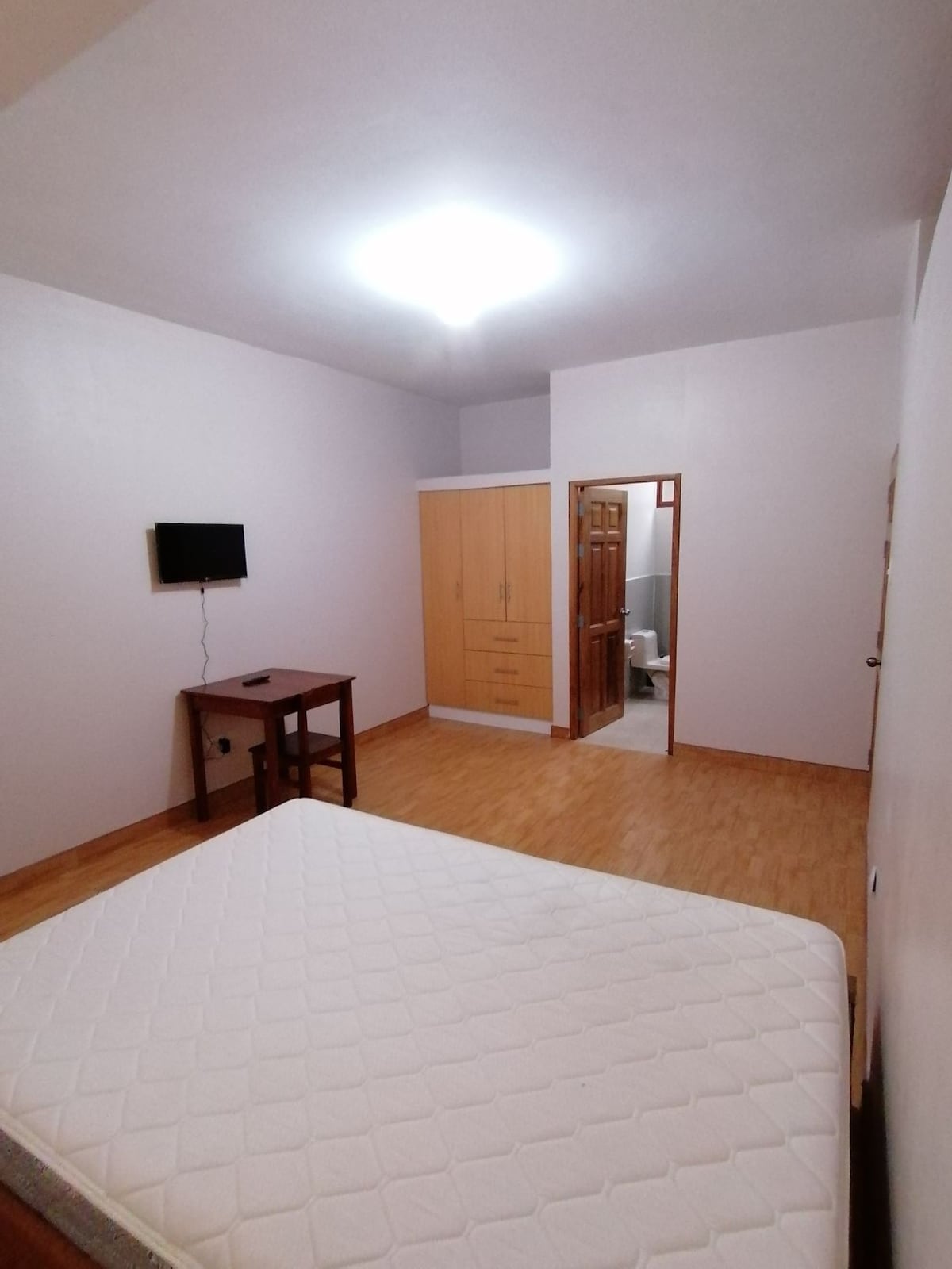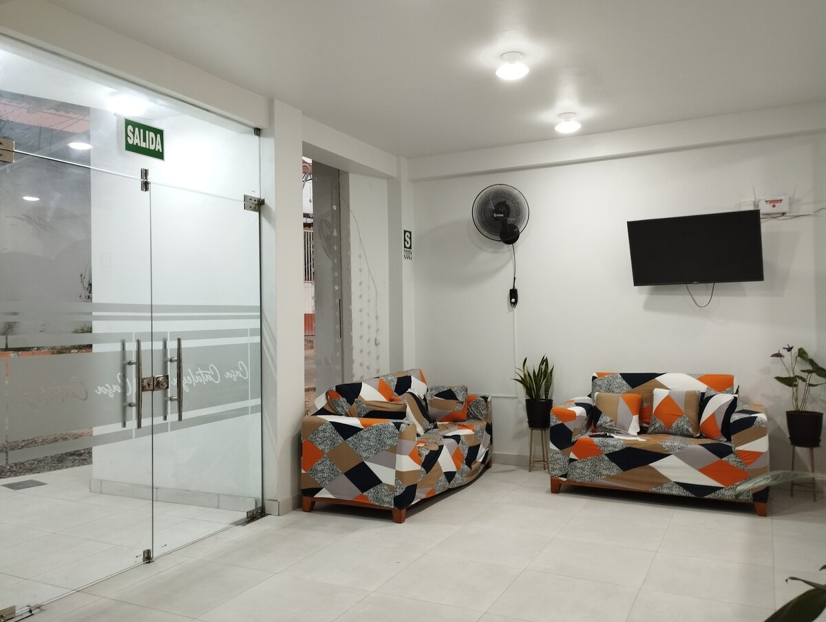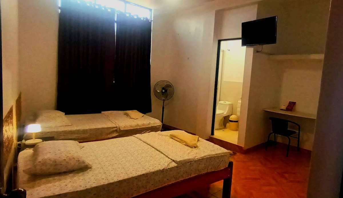 Nuestra habitacion privada B, cuenta con 1 cama matrimonial, 1 ropero, mesa de noche, ventilador portátil potente,TV Cable, Wi-Fi, baño privado con ducha con agua caliente. La cama la recibe vestida con sabanas, manta y almohadas. Además le entregamos toallas de ducha, toalla de manos, ph, shampoo y jaboncillo. Puede usar las areas comunes de la casa: sala-comedor, cocina y terraza. **Recojo gratis del aeropuerto** (para estancias de 7 noches a mas, previa coordiancion con 24 h de antelacion)