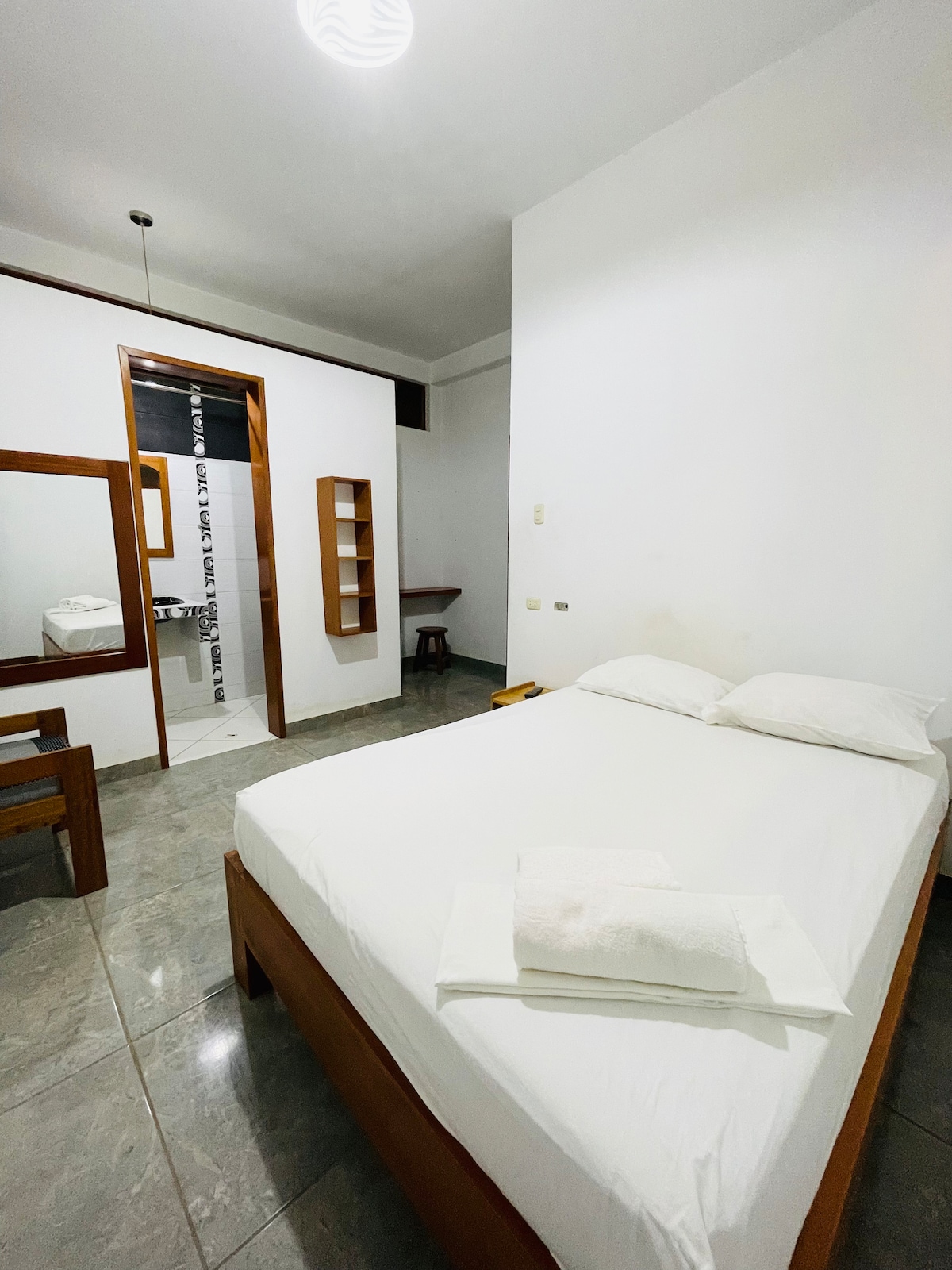 En esta habitación céntrica en el 2do. piso podrás disfrutar de la sencillez y calidez con cama de 2 plazas (matrimonial), zona segura (cámaras de vigilancia), tranquilo y acogedor; es un bello lugar en nuestra Selva Peruana.
