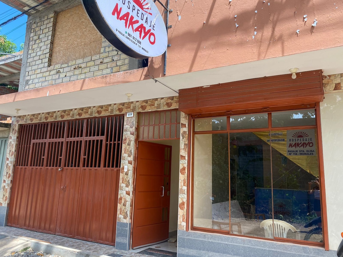 Nuestra casa es acogedora, es amplia,con espacios comunes como la cocina ,donde puedes utilizar el mobiliario, guardar cosas en el refrigerador, cocinar, el patio con mesas para desayunar y almorzar .Tienes WIFI las 24 hs. y puedes hacer uso de la lavadora con aporte .Nos encontramos en un barrio central y tranquilo a 5 cuadras cortas de la Plaza de Armas de Tarapoto, con acceso a cajeros, bancos,bares, negocios,bodegas y supermercados.