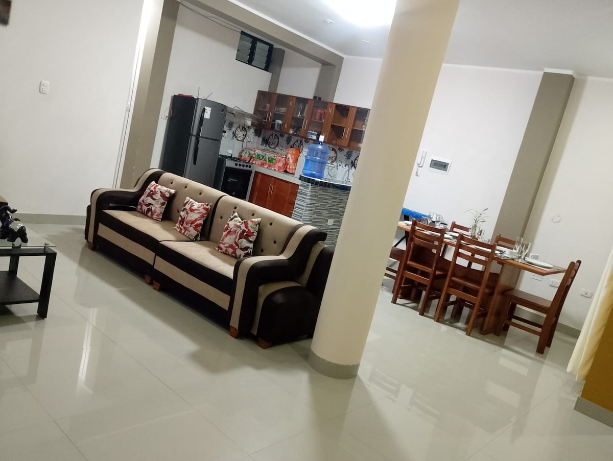 Lugar acogedor y céntrico en Tarapoto 1. Habitación equipada, 2 camas de 2plz, armario, planchador, ventilador, para garantizar tu confort. 2. Cocina comedor equipado. 4. Zona de trabajo o estudio 5. Acogedora sala de estar cuenta con TV (Netflix/Disney) 6. Lugar iluminado y fresco. 7. Atención personalizada. En Español, inglés y/o portugués. 8. De requerir un servicio adicional, es cuestión de coordinar con el Host. 9. Costo adicional por Piscina que se encuentra a una cuadra.