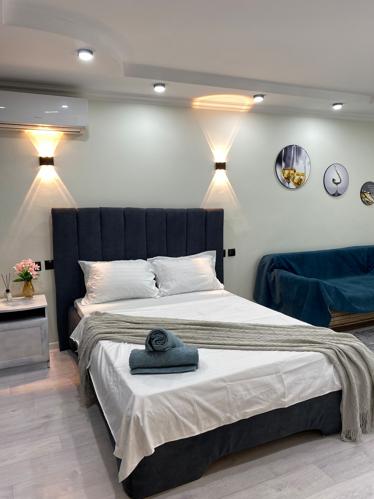 Современная 2комнатная квартира класса люкс, оформленная в спокойных светлых серых тонах, создаёт ощущение комфорта и уюта с первых минут. Спальня оборудована полноценным спальным гарнитуром: большая удобная кровать, комод для хранения вещей и туалетный столик. Чистая постель, комплект мягких полотенец. Гостиная — просторная и стильная, с раскладным диваном, который может служить дополнительным спальным местом. Кухня полностью укомплектована всем необходимым для проживания.