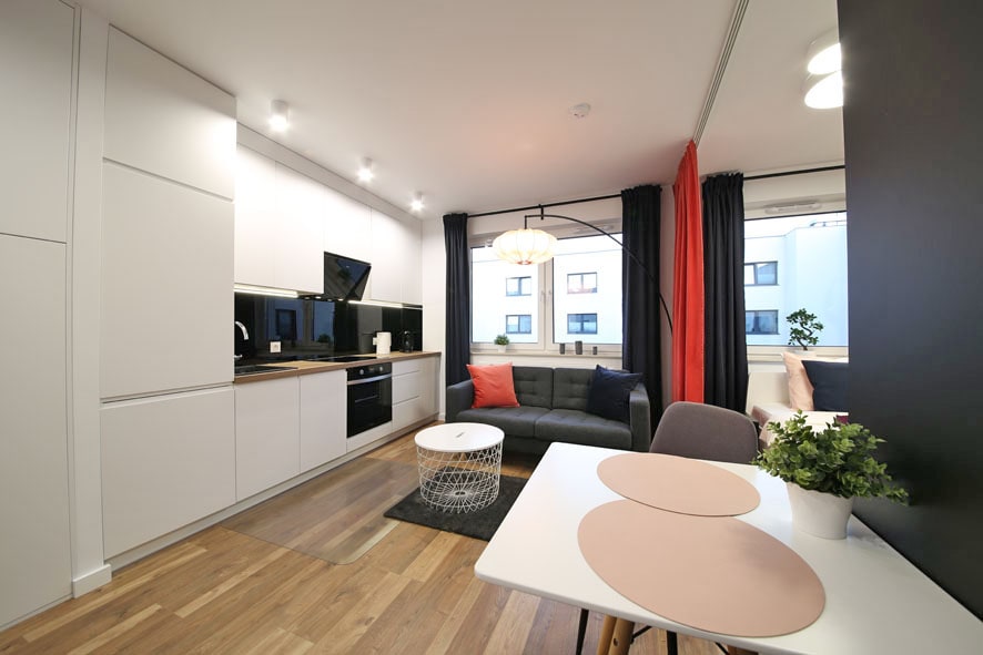 Elegancko urządzony i wyposażony apartament mieści się w nowym budynku przy ul. Jagiełły we Wrocławiu. Widok z apartamentu roztacza się na wewnętrzne patio, co zapewnia ciszę i spokój. Powierzchnia wynosi 30m2, wszystkie pomieszczenia są do wyłącznej dyspozycji. Wygodny apartament typu studio wyposażony jest zarówno w rozkładaną sofę jak również podwójne łóżko sypialniane. Znajduje się tu również wydzielony aneks kuchenny oraz łazienka.