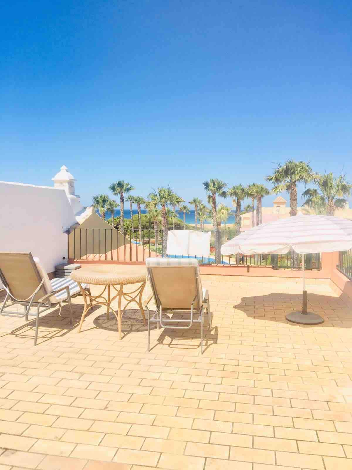 Spacious front line 2 bed/2 bath (max 4+1 child) beach house on two floors with large private terraces. Wide uninterrupted views over clear Mediterranean seas to Africa. Just a few metres from the beach. Mature manicured lawned gardens with palm trees and pretty flower borders. Two big communal pools. Gate out to coastal path directly alongside the beach. Private with own front door within secure gated community with parking. Sat TV, Wifi, aircon/heating. Beach restaurants in walking distance
