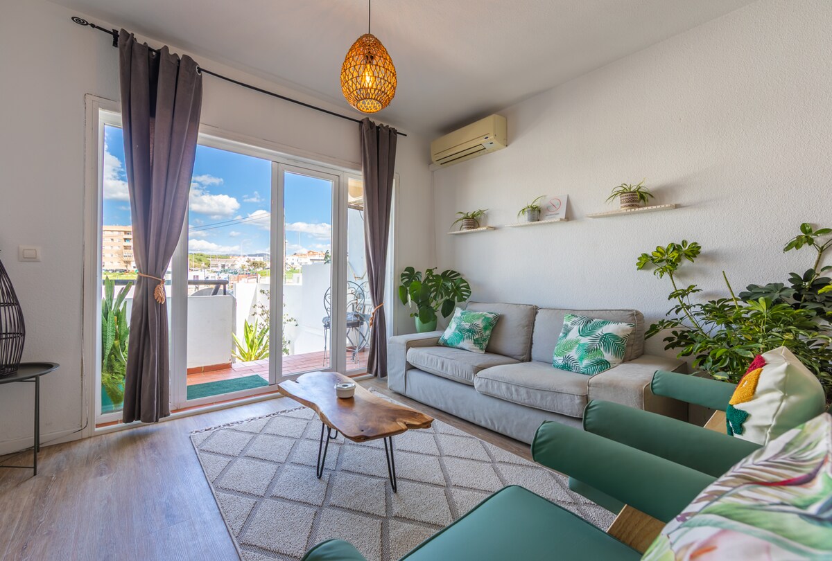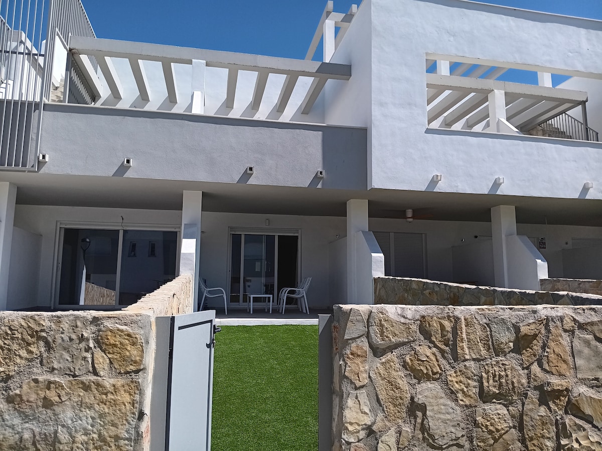 Spacious front line 2 bed/2 bath (max 4+1 child) beach house on two floors with large private terraces. Wide uninterrupted views over clear Mediterranean seas to Africa. Just a few metres from the beach. Mature manicured lawned gardens with palm trees and pretty flower borders. Two big communal pools. Gate out to coastal path directly alongside the beach. Private with own front door within secure gated community with parking. Sat TV, Wifi, aircon/heating. Beach restaurants in walking distance