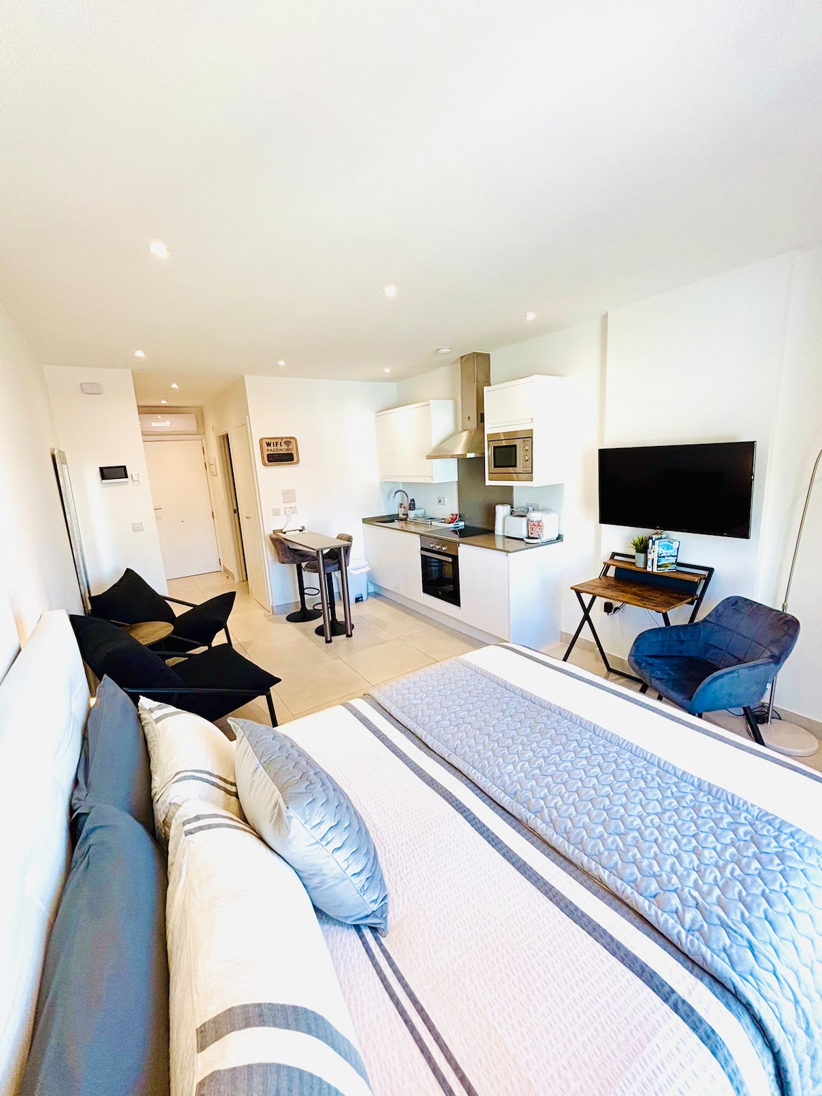 Stay in a modern, thoughtfully designed studio apartment that caters to couples and solo travellers looking for the ideal base to explore Gibraltar. This space features all the essentials for a comfortable stay, plus exclusive access to a beautiful outdoor swimming pool. Watch the sky transform with stunning sunsets over Spain’s coastline, while elegant super yachts drift into view against Africa’s faint silhouette. This studio offers simplicity and comfort for ultimate relaxation