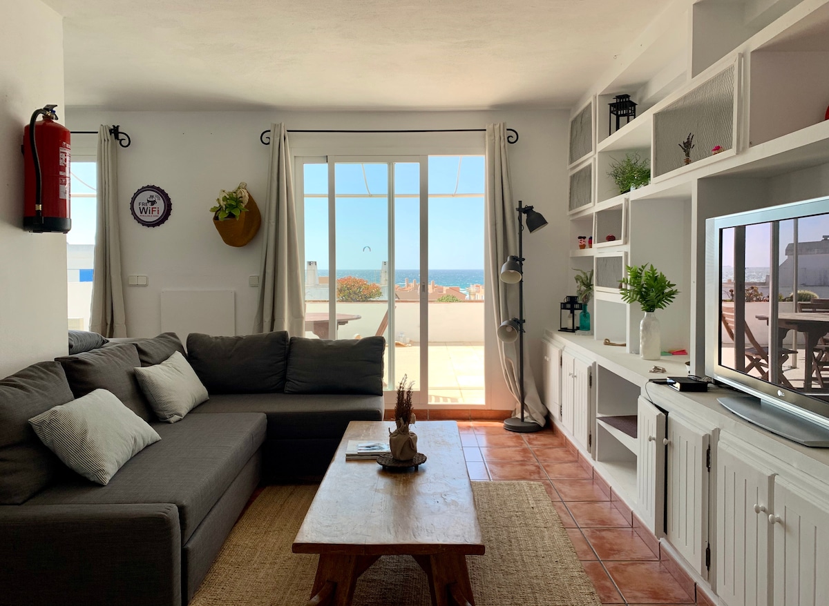 Precioso ático con amplia terraza y encantadoras vistas al mar. Loft de 50 m2 + 10 m2 de terraza con una cama de matrimonio para 2 personas. Está muy cerca de la playa de Los Lances (1 min. caminando) y de los bares y restaurantes del paseo marítimo. También está muy bien situado para visitar el centro (300 m.) o los supermercados y tiendas de Tarifa (200 m.) Perfectamente equipado incluso para vivir una larga temporada (aquí vivo yo durante todo el invierno) Incluye parking privado